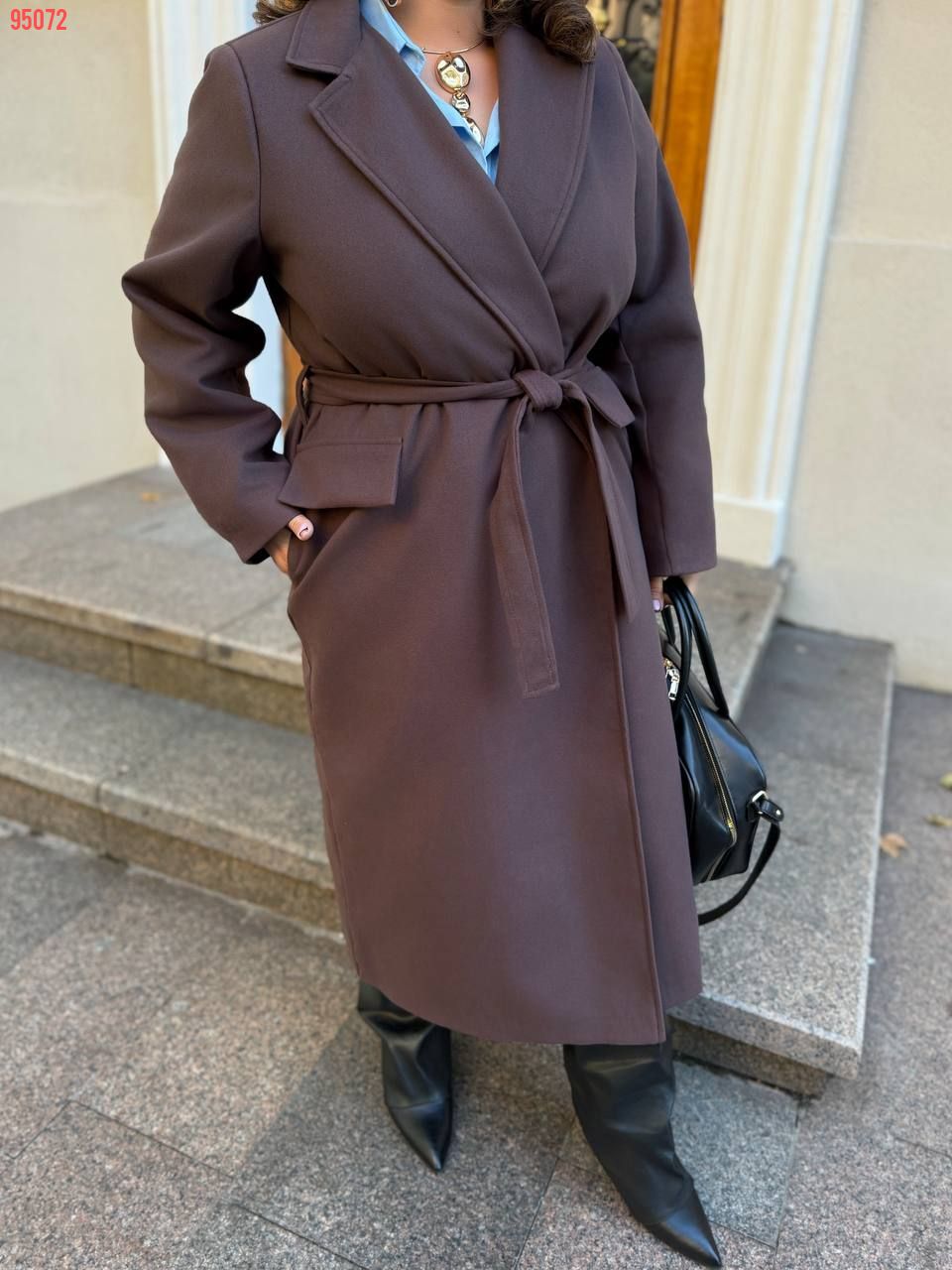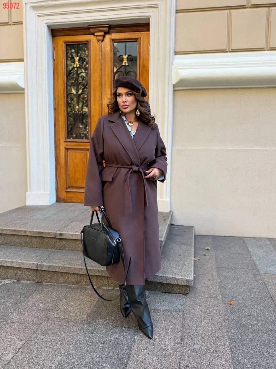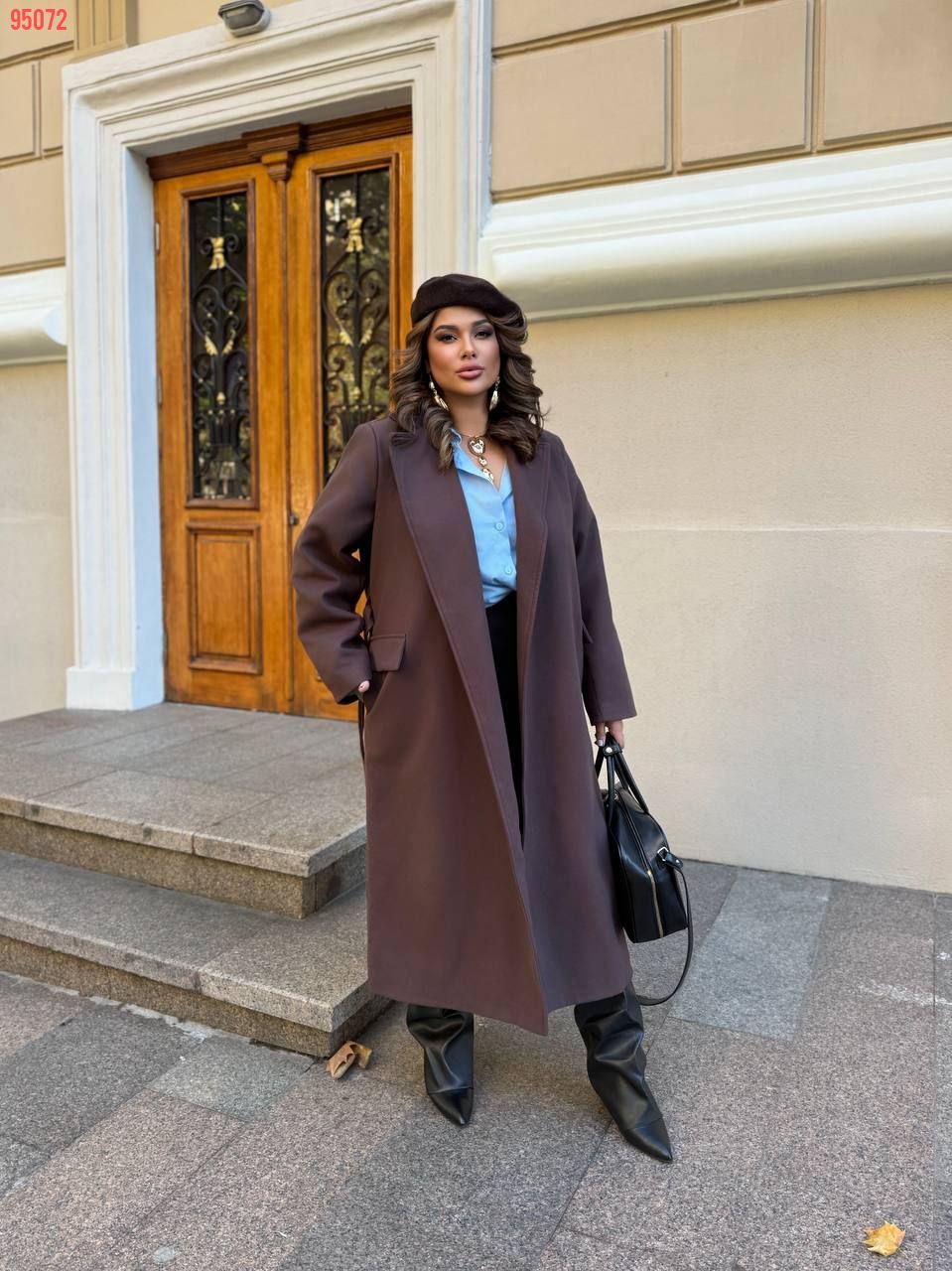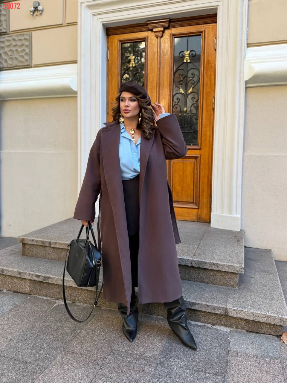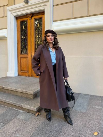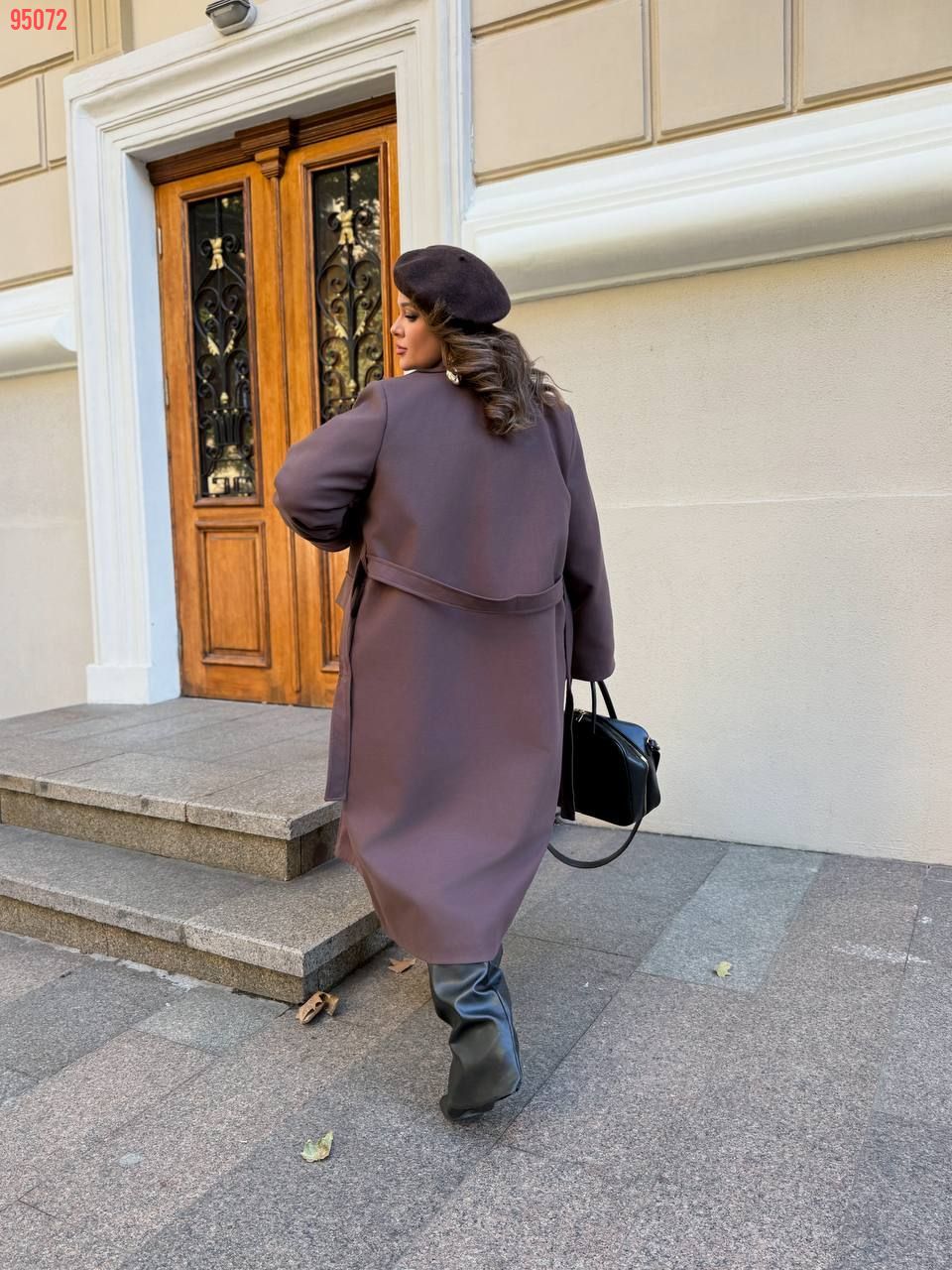 Підкладка стьобана на синтепоні 100. Крій оверсайз, чоловічий двобортний піджак (тренд цього сезону). Підплечники вшити. Застібки – гудзики, додається пояс – можна приталювати, створюючи інший стиль образу. Довжина виробу 124 см, довжина рукава – 63см