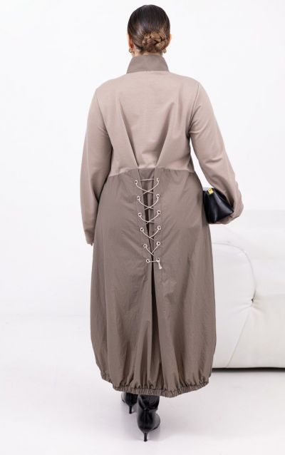 Легка елегантність з акцентом на комфорт: спортивні деталі зустрічаються з міським шиком. Стійка-горловина з блискавкою до рівня грудей + окрема блискавка від грудей донизу, комбінована фактура (двонитка + жатa плащівка), дві накладні кишені. Ззаду – декоративна шнурівка для регулювання об’єму на талії. Низ на резинці для охайної посадки.