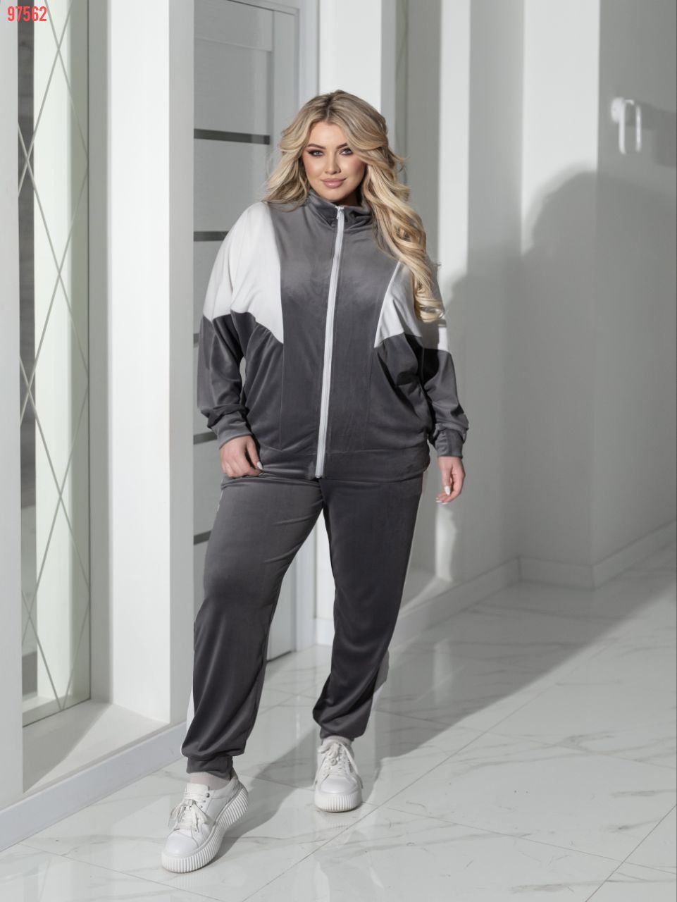 Комфортний та сучасний костюм із м'якого велюру гарної якості. Тканина приємна до тіла, гарно виглядає та має чудово розтяжність . Кофтинка вільного крою з білими вставками та з кишенями. Штани с кишенями та лампасами, низ штанів на манжетах . Костюм підійде як для прогулок так для повсякденного носіння.