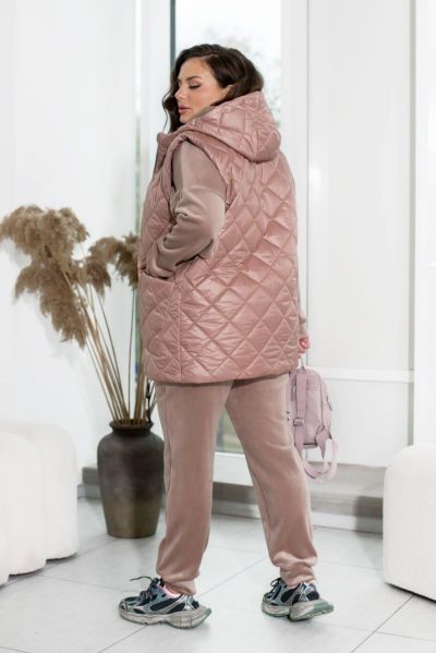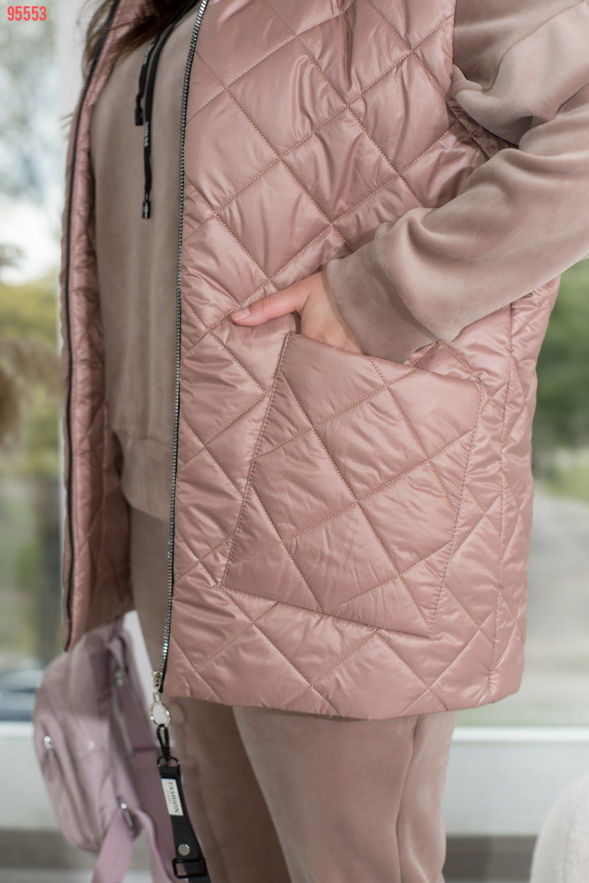 Зустрічайте наш універсальний костюм трійка, створений для стильних і зручних образів у прохолодну погоду. Комплект складається з жилетки з капюшоном та накладними кишенями, кофти зі спущеними рукавами та капюшоном зі шнурком, а також прямих штанів з середньою посадкою і кишенями по боках.Жилетка додає практичності та стилю завдяки капюшону і накладним кишеням. Кофта з капюшоном і спущеними рукавами створює невимушений і затишний образ. Прямі штани з середньою посадкою забезпечують комфорт і стиль. Вони практичні завдяки кишеням по боках і низу на резинці. Цей костюм – вибір активних жінок, які цінують якість і стиль.Ідеальний варіант, для жінок, які поспішають та полюбляють бути в комфорті. Доповніть образ кросівками чи об'ємними чоботями