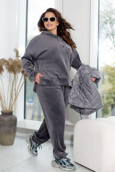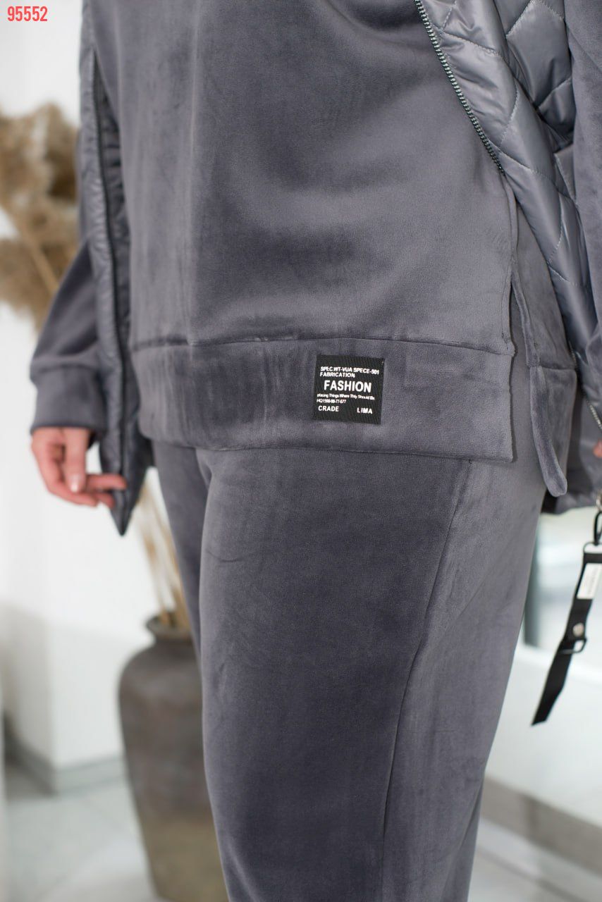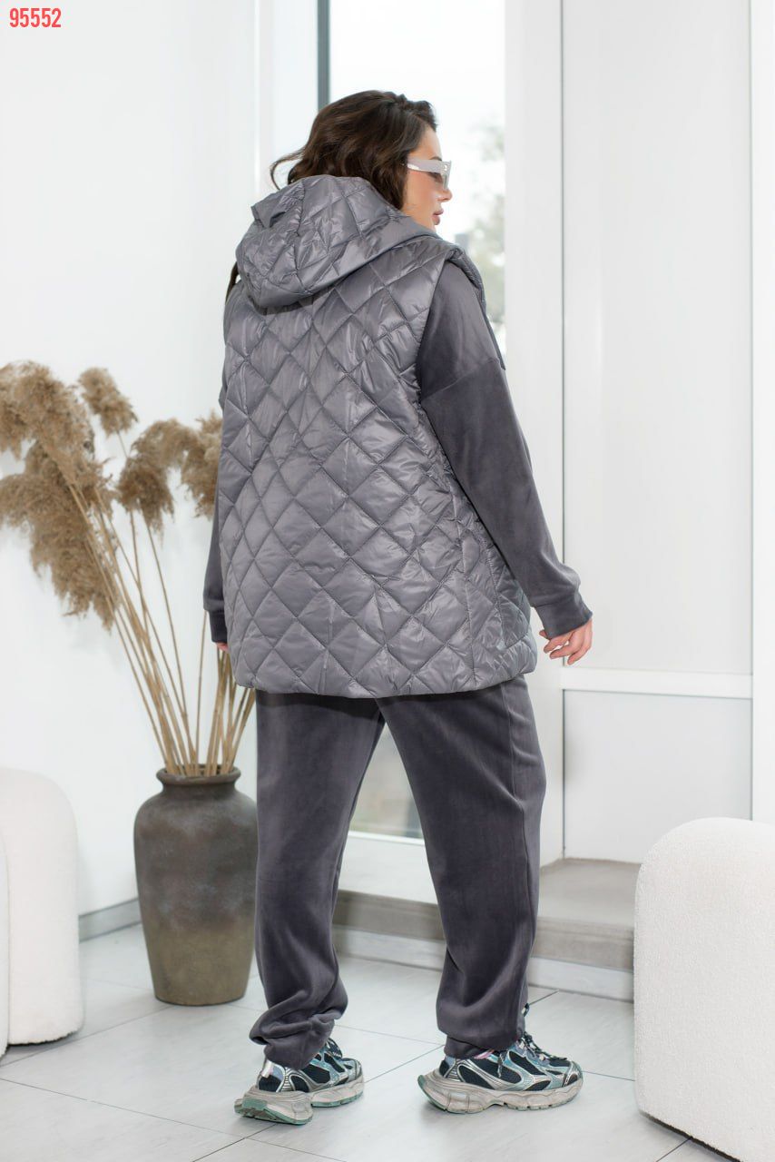 Зустрічайте наш універсальний костюм трійка, створений для стильних і зручних образів у прохолодну погоду. Комплект складається з жилетки з капюшоном та накладними кишенями, кофти зі спущеними рукавами та капюшоном зі шнурком, а також прямих штанів з середньою посадкою і кишенями по боках.Жилетка додає практичності та стилю завдяки капюшону і накладним кишеням. Кофта з капюшоном і спущеними рукавами створює невимушений і затишний образ. Прямі штани з середньою посадкою забезпечують комфорт і стиль. Вони практичні завдяки кишеням по боках і низу на резинці. Цей костюм – вибір активних жінок, які цінують якість і стиль.Ідеальний варіант, для жінок, які поспішають та полюбляють бути в комфорті. Доповніть образ кросівками чи об'ємними чоботями