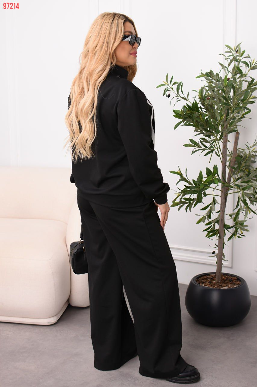 48–50 Кофта: ОГ 116 • ОТ 116 • ОБ по манжету 114 • довжина 65 • рукав 62 • біцепс 41 см Штани: талія 82/98 (вільно/розтяг) • стегна 108 • довжина 108/77 (зовн./внутр.) см