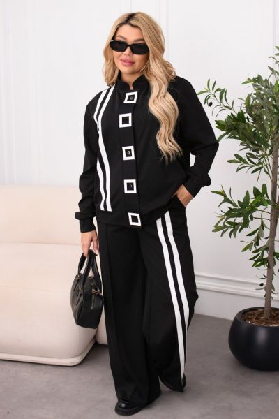 Стильний брючний костюм з еластичної тканини для тих, хто цінує баланс комфорту й елегантності. Лампаси додають динаміки, а геометричний декор (квадрат) на кофті – стильний акцент. Кофта на ґудзиках по всій довжині з прорізними кишенями. Вільні штани середньої посадки з еластичною резинкою на поясі – зручні на щодень і для поїздок.
