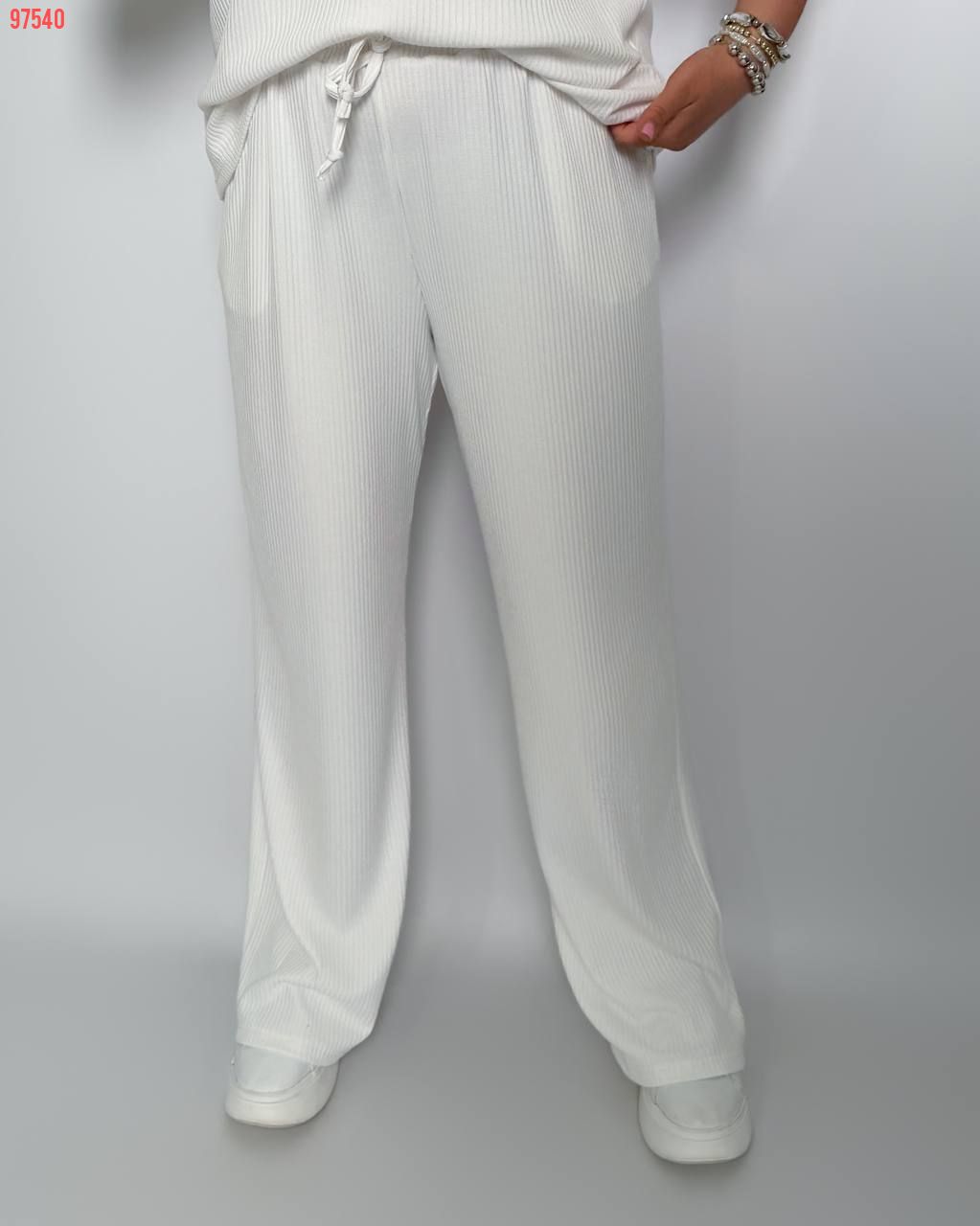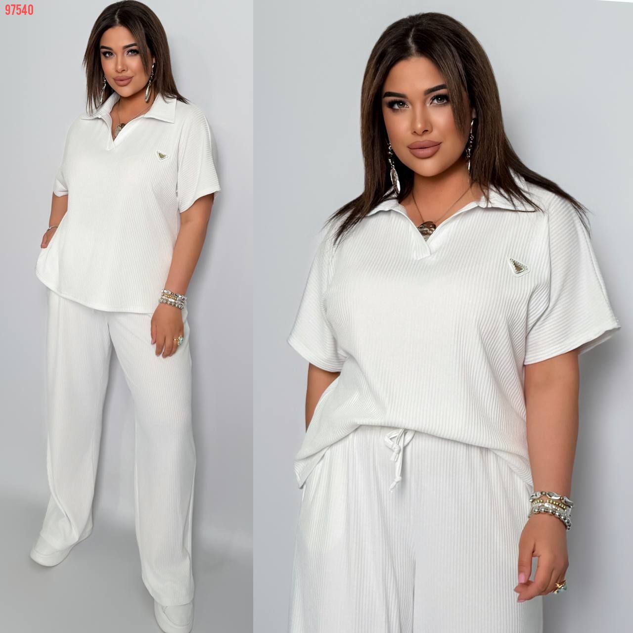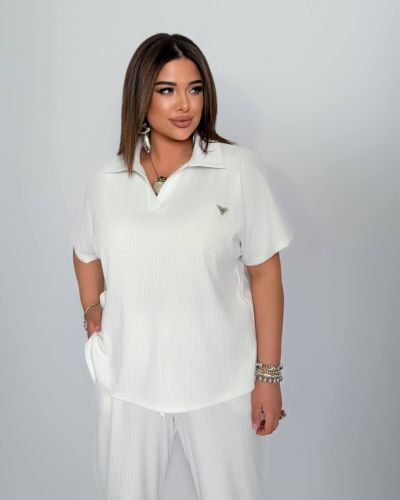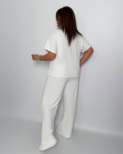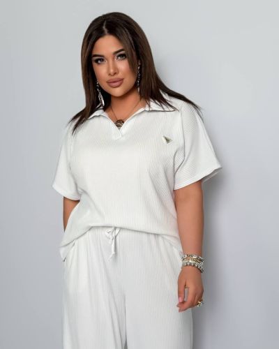 Стильний комфортний костюм “Barcelona” з трикотажу рубчик хб стрейч: футболка у стилі поло оверсайз з Акс + штани прямі розширені з високою посадкою з кішенями у бічних швах, з куліскою на поясі