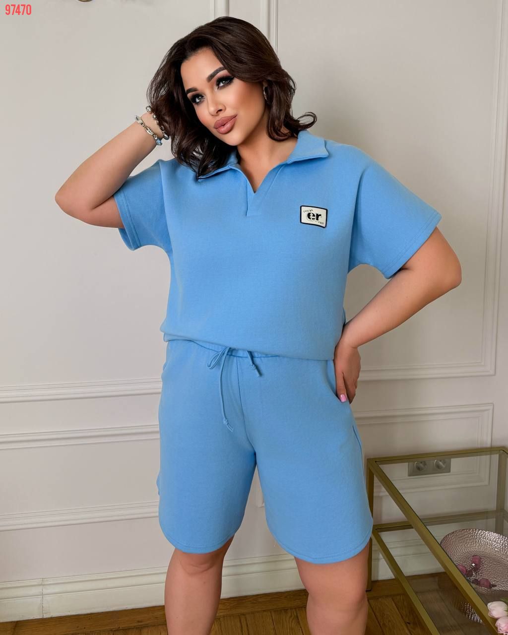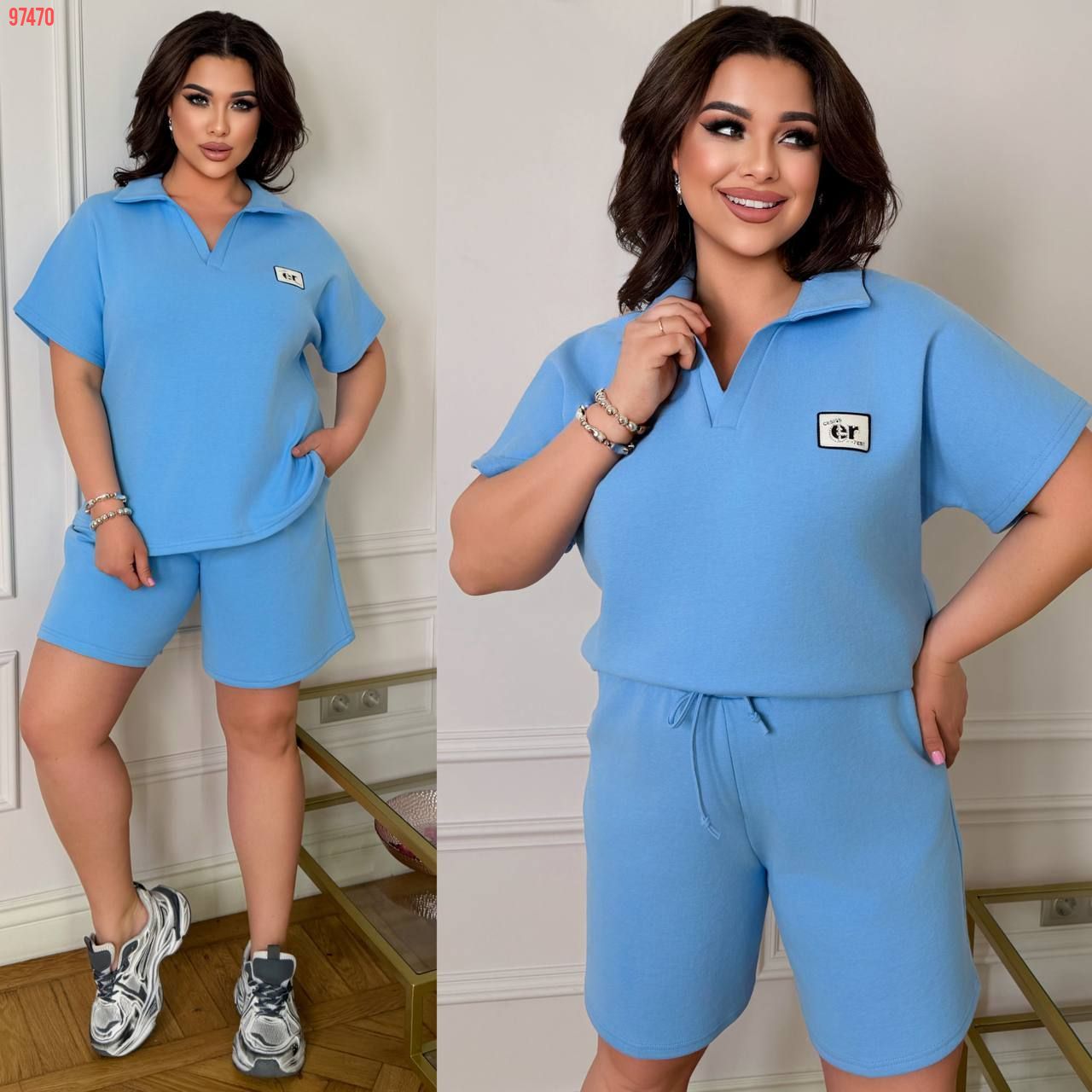 футболка поло у стилі оверсайз + шорти з високою посадкою з кішенями у бічних швах, з куліскою на поясі)