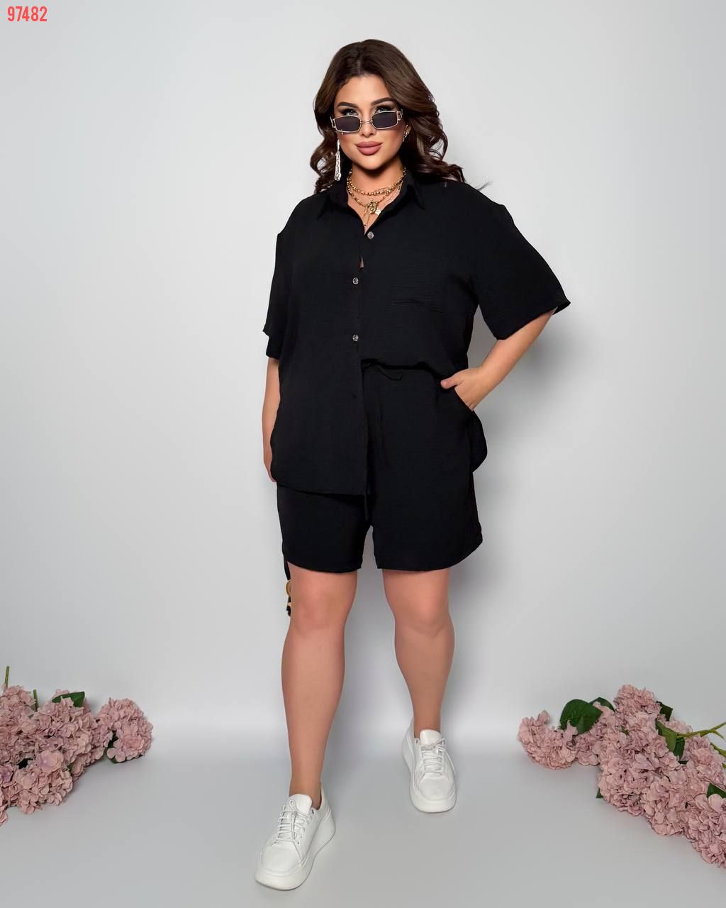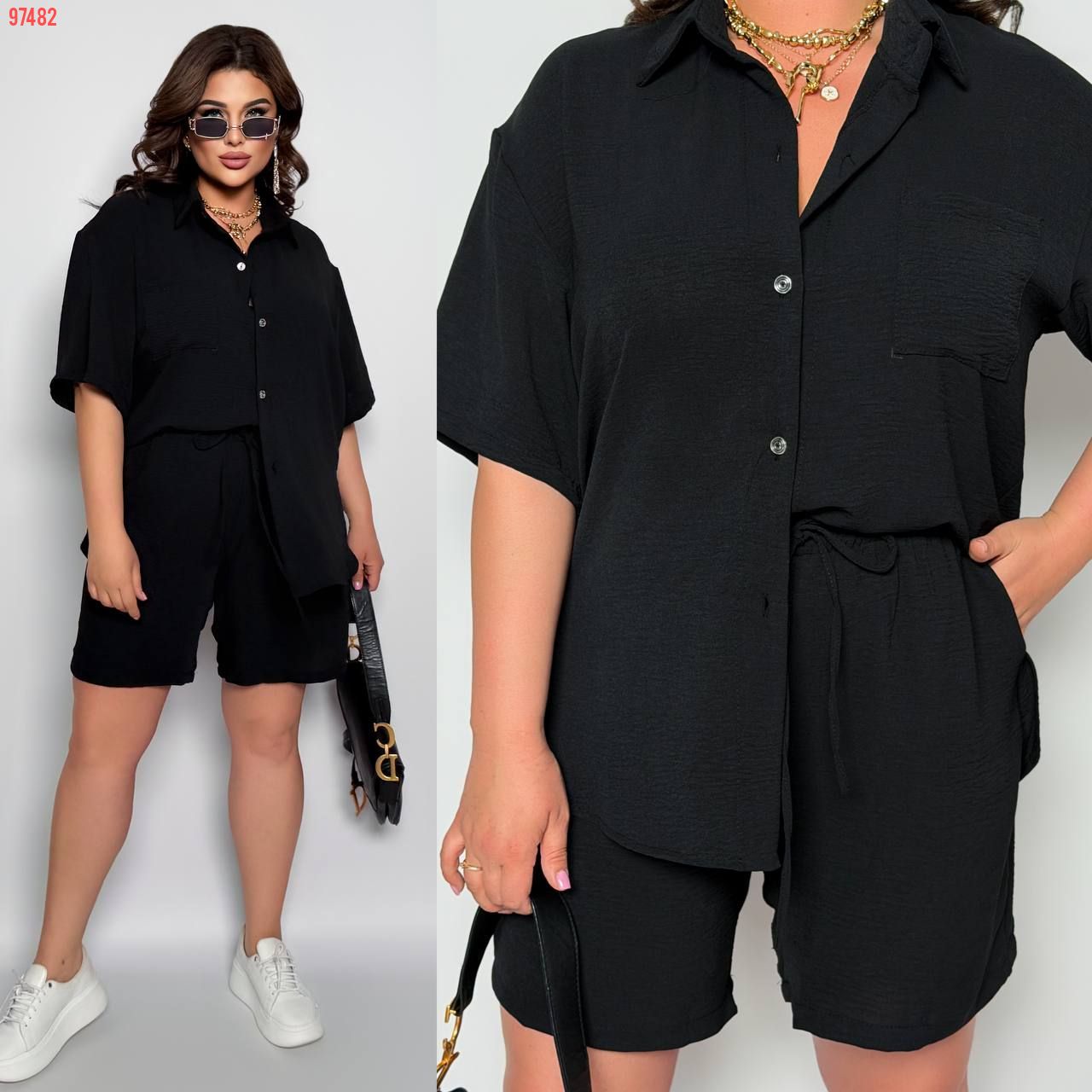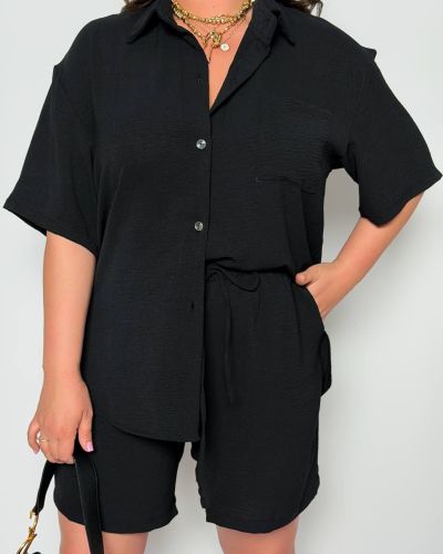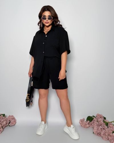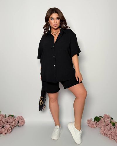 Стильний прогулянковий костюм з креп софту: Сорочка на гудзиках з кишенею , по низу з розрізами по боках + шорти з високою посадкою на гумці, з кишенями у бічних швах