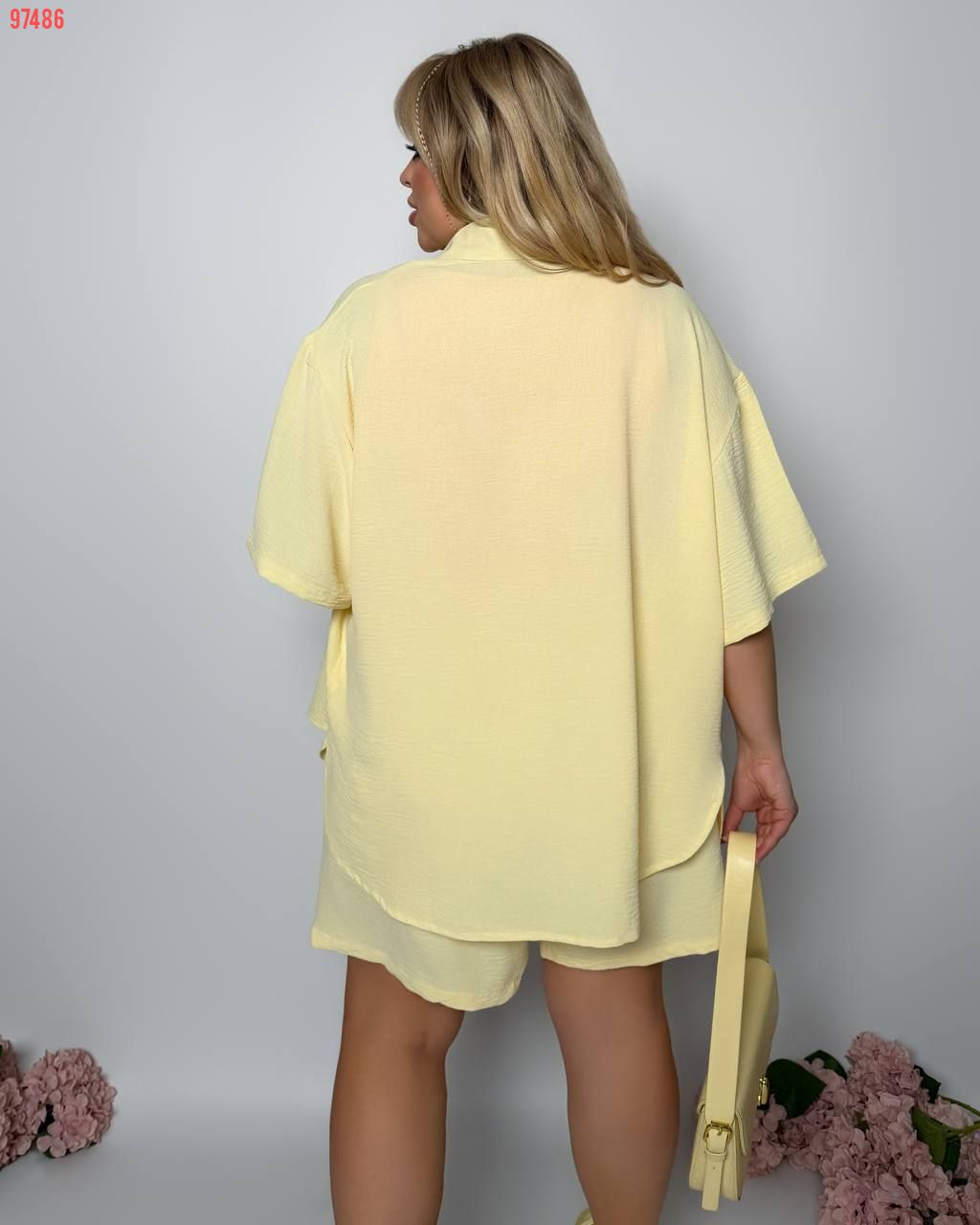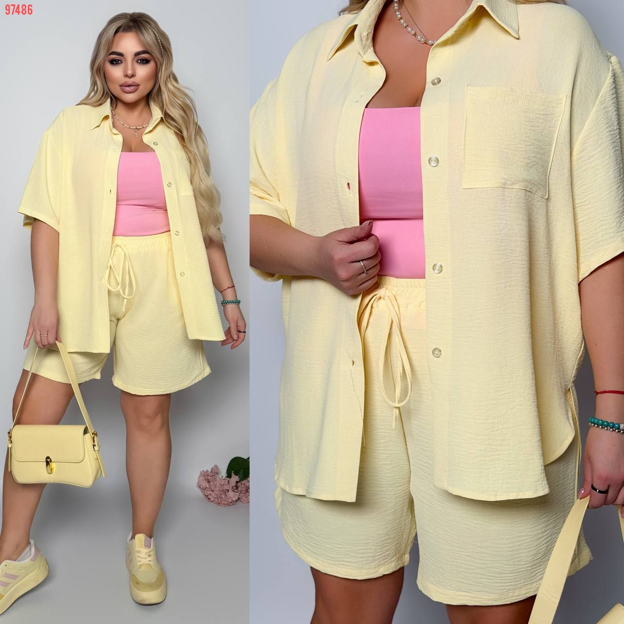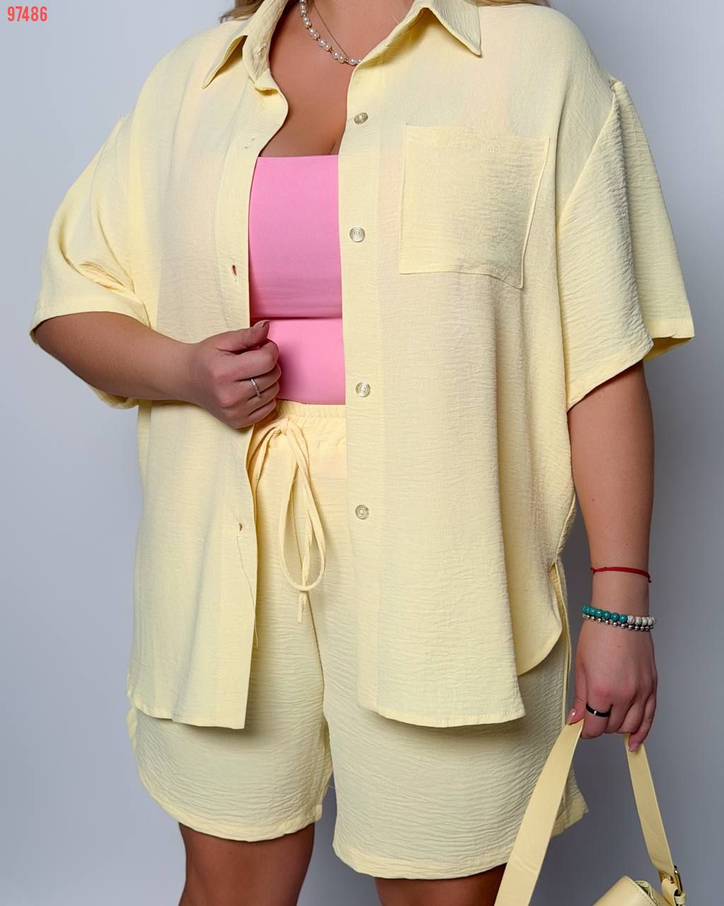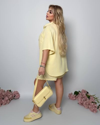 Стильний прогулянковий костюм з креп софту: Сорочка на гудзиках з кишенею , по низу з розрізами по боках + шорти з високою посадкою на гумці, з кишенями у бічних швах
