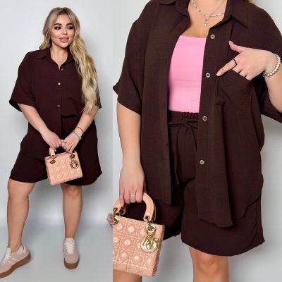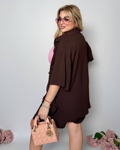 Стильний прогулянковий костюм з креп софту: Сорочка на гудзиках з кишенею , по низу з розрізами по боках + шорти з високою посадкою на гумці, з кишенями у бічних швах
