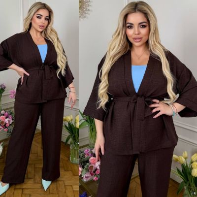 Стильний прогулянковий костюм зі льону «Бохо»: вільний кардиган під пояс + Штани з високою посадкою на гумці, з кишенями у бічних швах та куліскою на поясі.