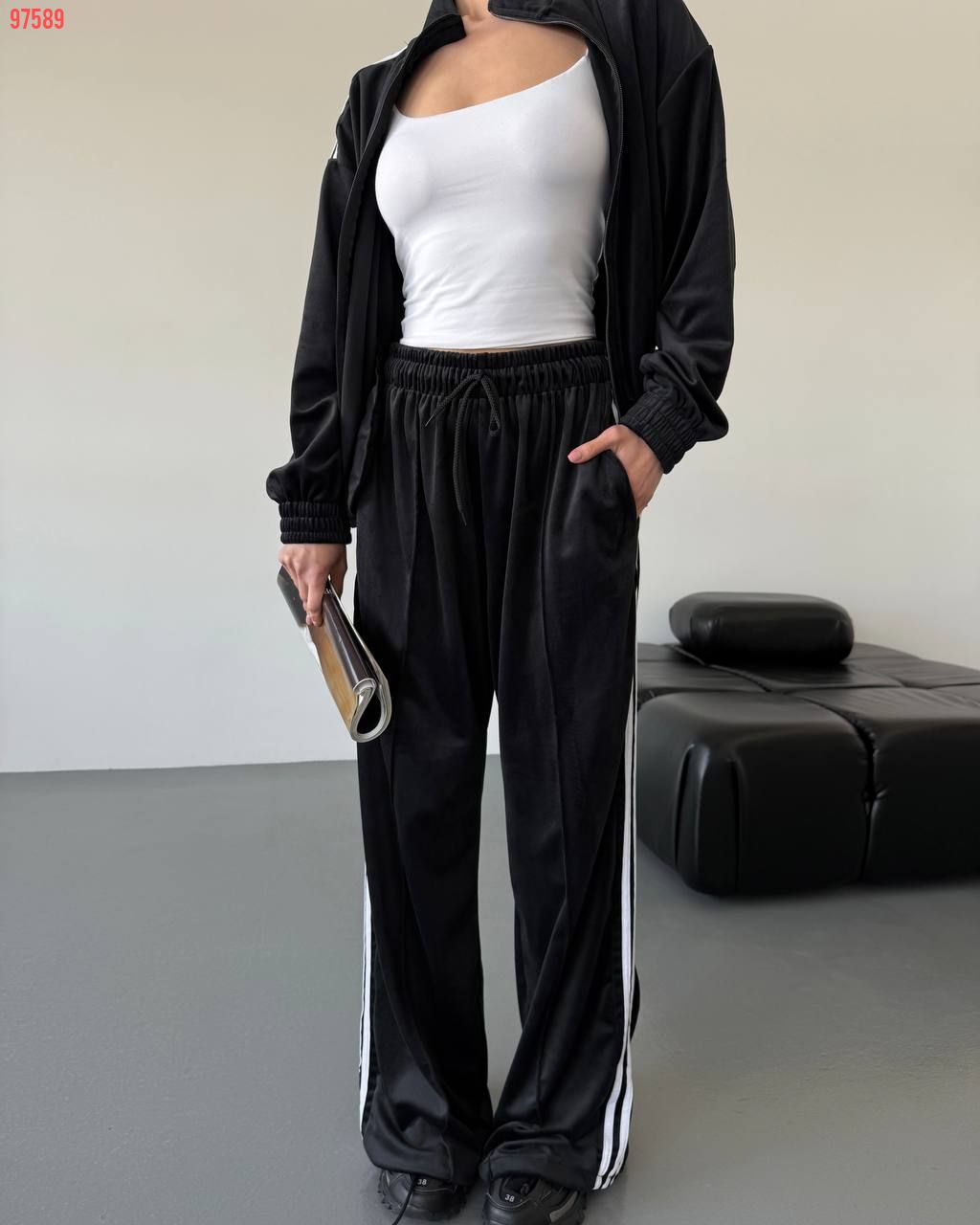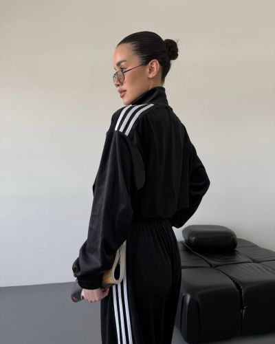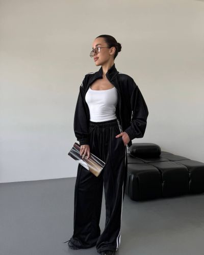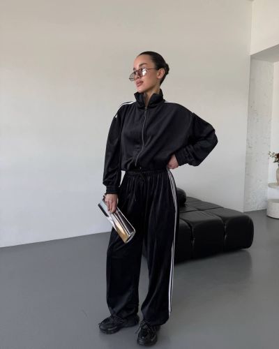 Стильний зручний костюм з лампасами на змійці, в стилі оверсайз. Мʼякий приємний до тіла велюр. Кофта знизу на резиночці. Штани з кишенями та знизу мають фіксатори, для зручності регулювання.