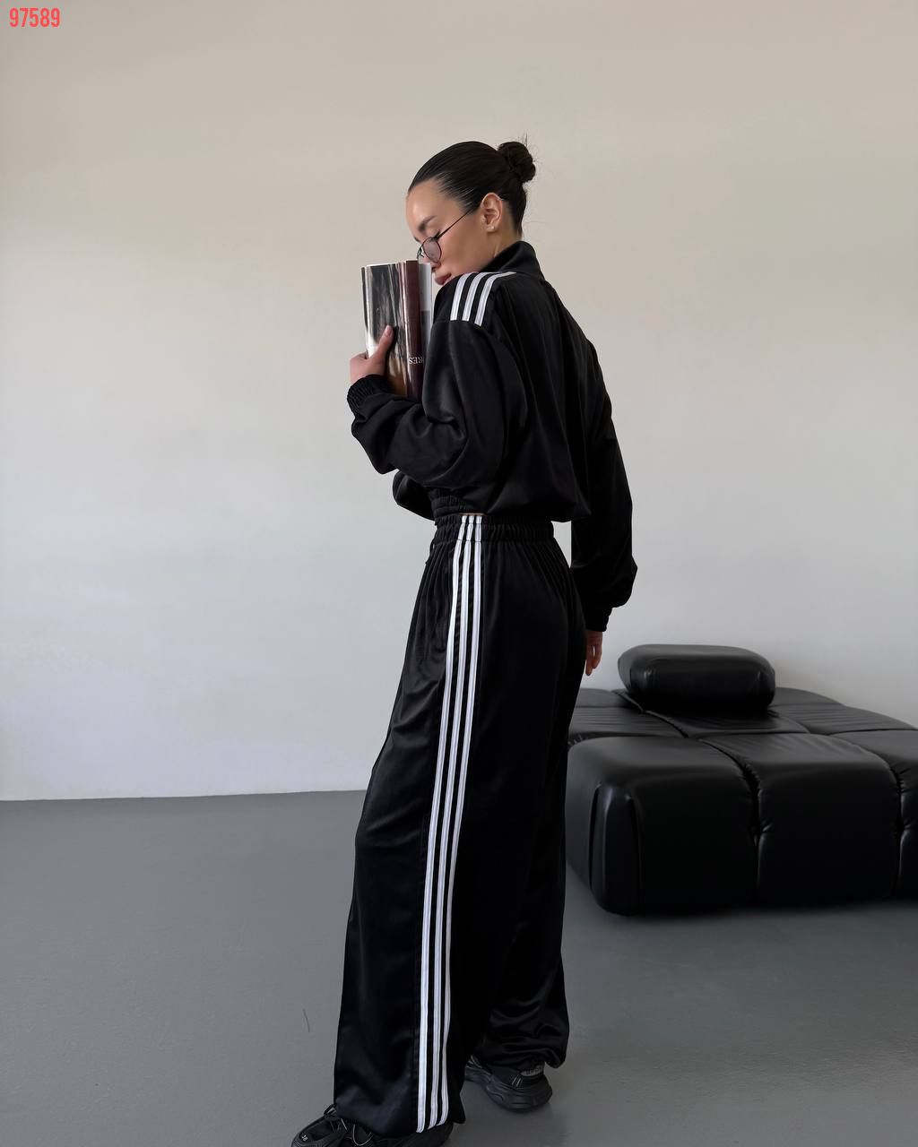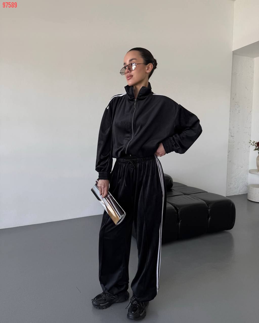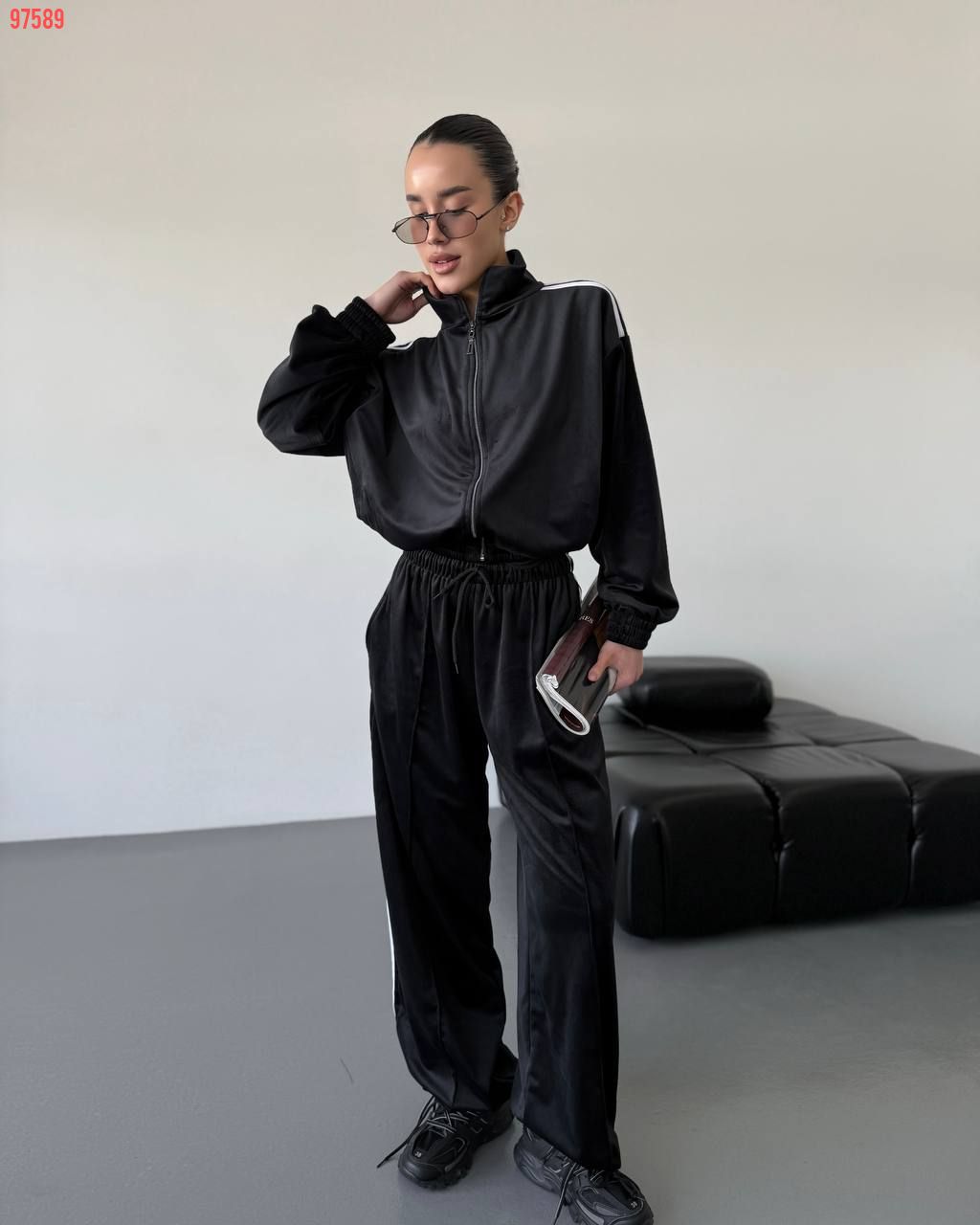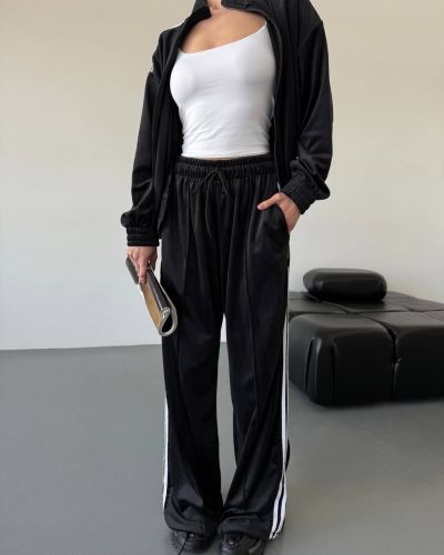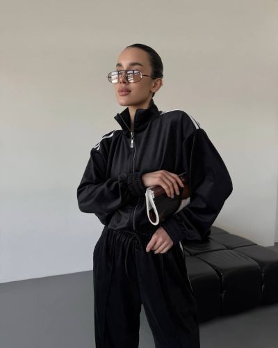 Стильний зручний костюм з лампасами на змійці чорний №97589