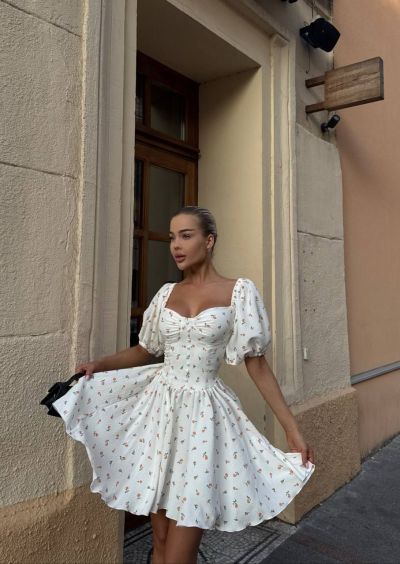 Модель стилізована обʼємним рукавчиком та пишною спідницею . Сукня має завʼязки на спинці, за допомогою яких можна регулювати обьєм декольте