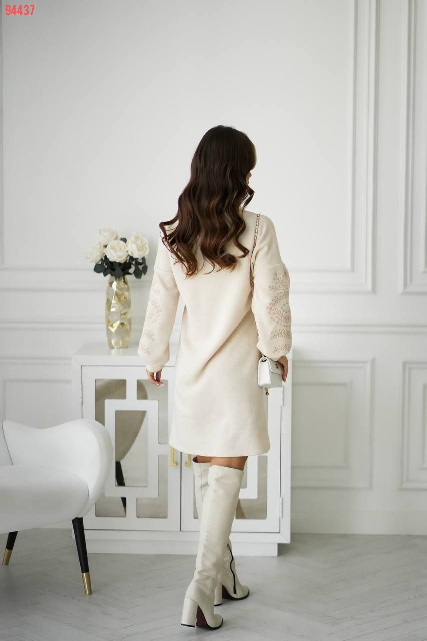 Сукня легко комбінується з високими чоботами, кросівками або класичними туфлями, створюючи стильні образи на будь-який випадок – від прогулянки до святкового вечора.