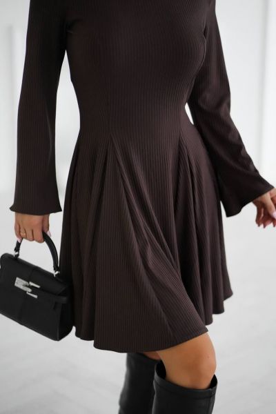 Стильна сукня в рубчик з приталеним верхом та розкльошеною спідницею, що гарно підкреслює талію. Довгий розкльошений рукав додає образу витонченості, а класичний круглий виріз зберігає стриманий та жіночний стиль. Справжній must-have сезону для святкових виходів та особливих моментів.