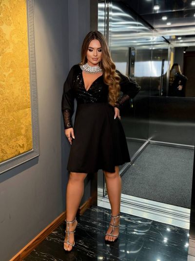 Тканина:верх - оксамит, розшитий паєтками (стрейчевий). Низ – софт -шовк чорного кольору. Одягається на запах.