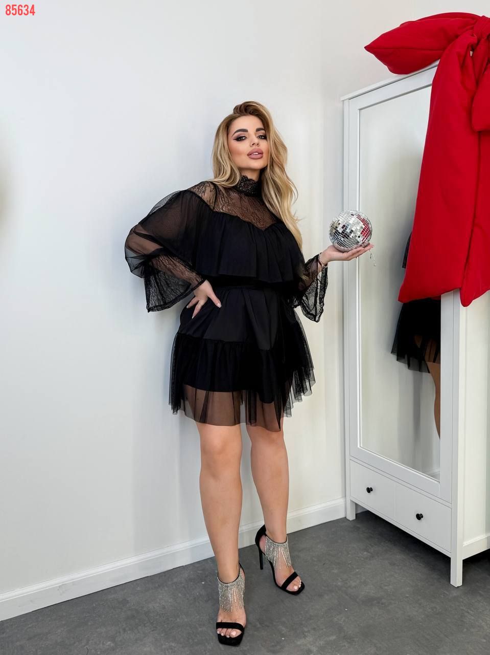 Рукави та рюші – сітка. Вставки французького мережива. Сукня вільного крою. Додається поясок для приталювання.