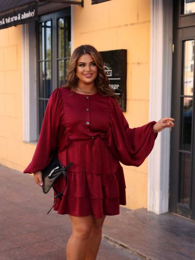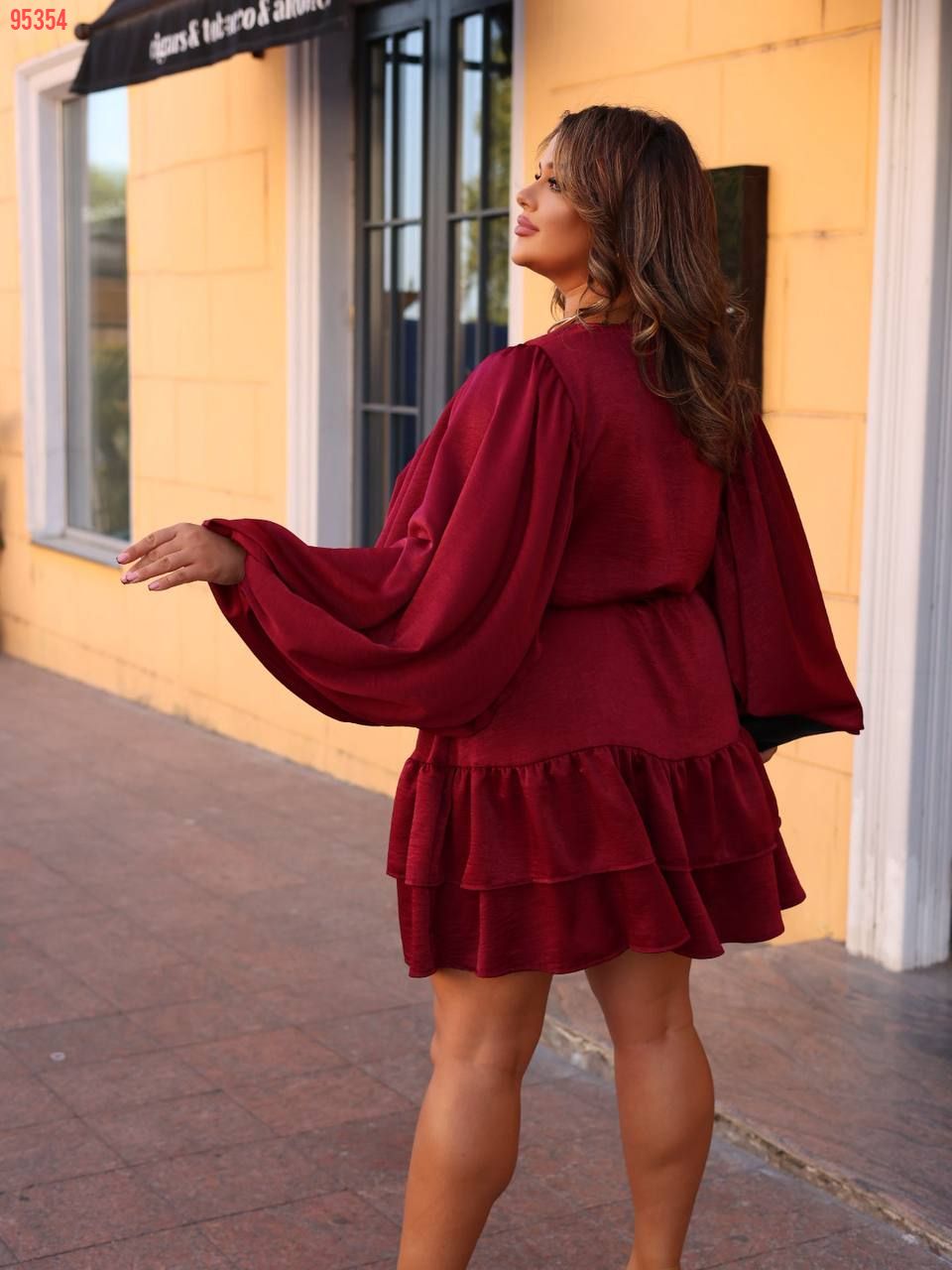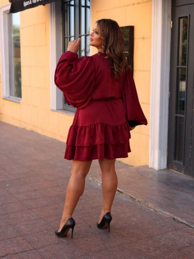 Сукня коротка, виконана з легкої, трохи блискучої тканини. Вільний фасон, з акцентом на талії завдяки поясу-стрічці. Довгі рукава, широкі, вільно спадають, надаючи образу романтичності та легкості. Зверху застібка на ґудзики спереду, що додає класичної нотки. Спідниця з двома ярусами воланів, які створюють об’єм та динаміку.