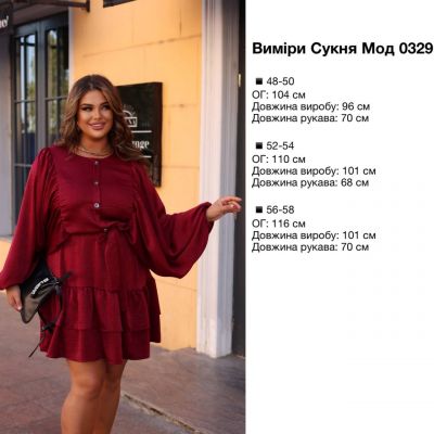 Сукня коротка, виконана з легкої, трохи блискучої тканини. Вільний фасон, з акцентом на талії завдяки поясу-стрічці. Довгі рукава, широкі, вільно спадають, надаючи образу романтичності та легкості. Зверху застібка на ґудзики спереду, що додає класичної нотки. Спідниця з двома ярусами воланів, які створюють об’єм та динаміку.