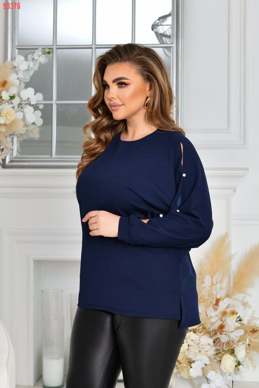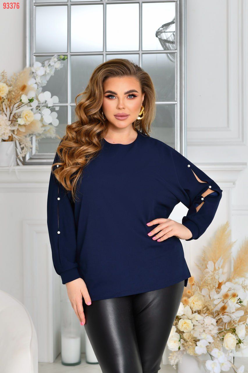 Стильна ошатна туніка із трикотажу креп-стретч (розтяжність середня). Силует «летюча миша». Виріз горловини круглий. Рукави на манжетах, цільнокроєні, виконані дуже оригінально із прорізями, декоровані якісними штучними пробивними перлинками ( закріплені надійно). Низ туніки асиметричний, попереду трохи коротший. З боків оброблені невеликі розрізи. Застібок, кишень немає.