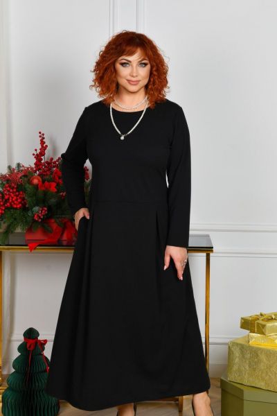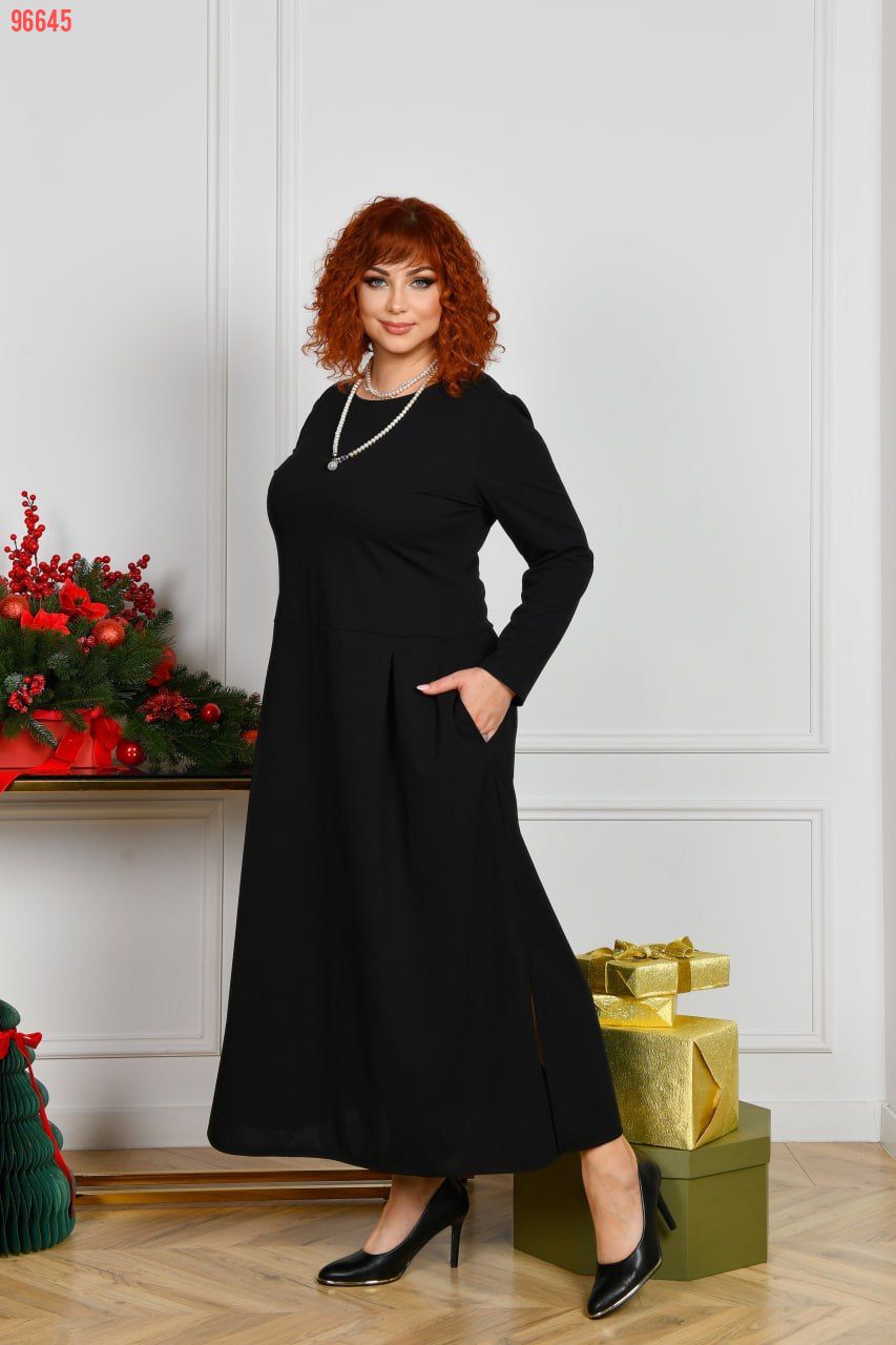 Силует сукні довгий, напівприталений. Виріз горловини круглий, рукави повної довжини. Лінія талії відрізна, трохи занижена, спідниця із защипами, в бічних швах оброблені кишені. Застібки немає. Внизу з боків розрізи, що додає образу жіночності. Сукня добре приховує будь-які недоліки та робить силует стрункішим. Ідеально підійде як для повсякденних справ, так і на свята, якщо додати аксесуарів.