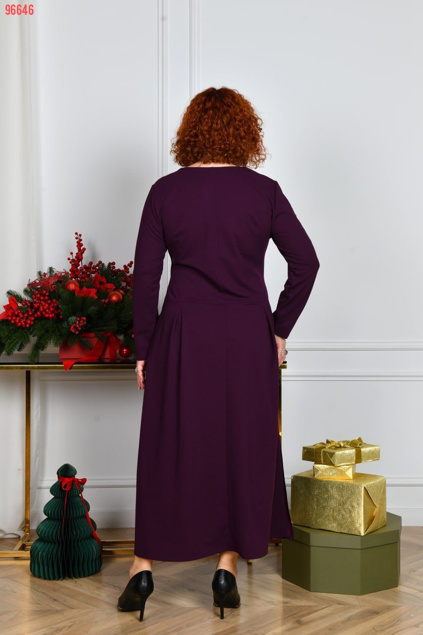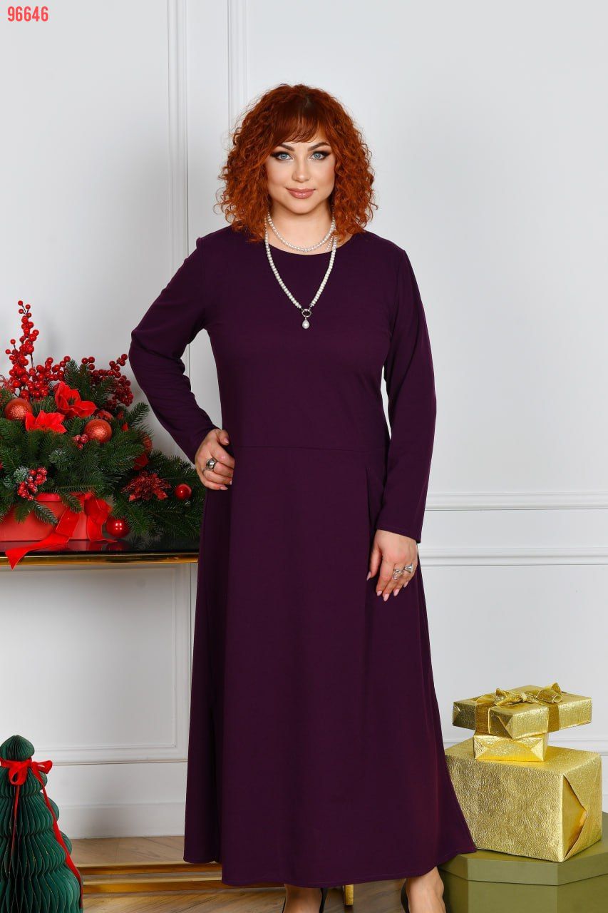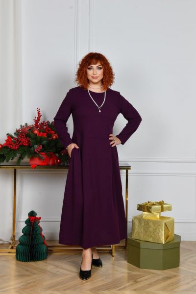 Силует сукні довгий, напівприталений. Виріз горловини круглий, рукави повної довжини. Лінія талії відрізна, трохи занижена, спідниця із защипами, в бічних швах оброблені кишені. Застібки немає. Внизу з боків розрізи, що додає образу жіночності. Сукня добре приховує будь-які недоліки та робить силует стрункішим. Ідеально підійде як для повсякденних справ, так і на свята, якщо додати аксесуарів.