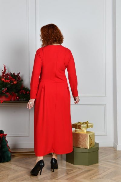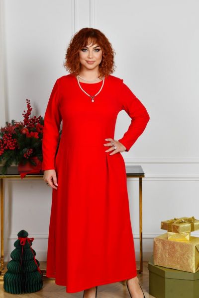 Силует сукні довгий, напівприталений. Виріз горловини круглий, рукави повної довжини. Лінія талії відрізна, трохи занижена, спідниця із защипами, в бічних швах оброблені кишені. Застібки немає. Внизу з боків розрізи, що додає образу жіночності. Сукня добре приховує будь-які недоліки та робить силует стрункішим. Ідеально підійде як для повсякденних справ, так і на свята, якщо додати аксесуарів.