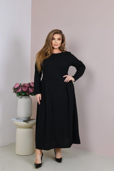 Силует сукні довгий, напівприталений. Виріз горловини круглий, рукави повної довжини. Лінія талії відрізна, трохи занижена, спідниця із защипами, в бічних швах оброблені кишені. Застібки немає. Внизу з боків розрізи, що додає образу жіночності. Сукня добре приховує будь-які недоліки та робить силует стрункішим. Ідеально підійде як для повсякденних справ, так і на свята, якщо додати аксесуарів.