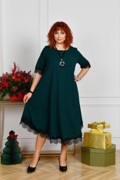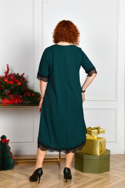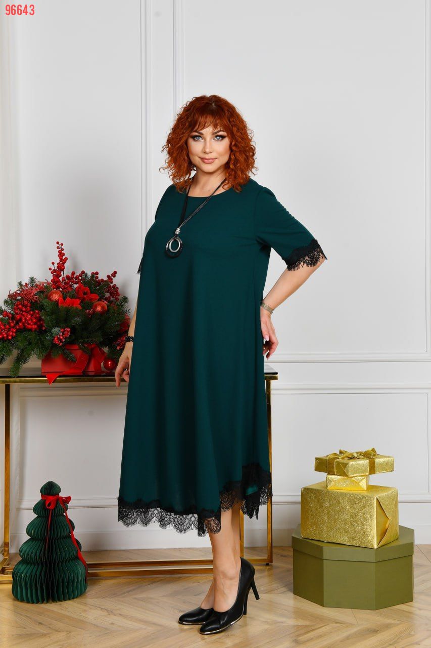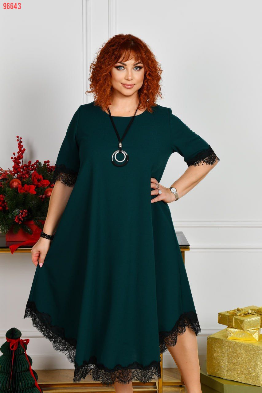 Неймовірно стильна сукня у вечірньому стилі, довжиною міді, А-подібного силуету. Виріз горловини круглий. Рукав довжиною трохи нижче ліктя. Сукня по рукавам та низу декорована чорним мереживом. Кишень та застібок немає.