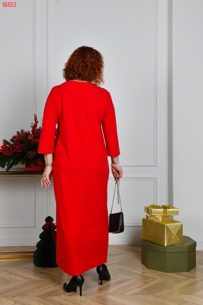 Довга сукня вільного прямого силуету з оригінальним вирізом горловини, яка декорована прикрасою з перлинками. Рукав прямий, трохи вкорочений. Попереду внизу оброблено розріз, що додає образу витонченості та стрункості. Застібок, кишень немає.