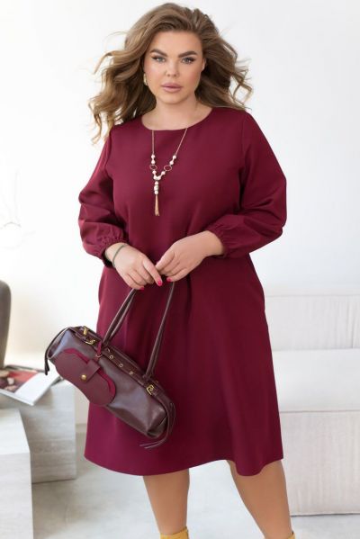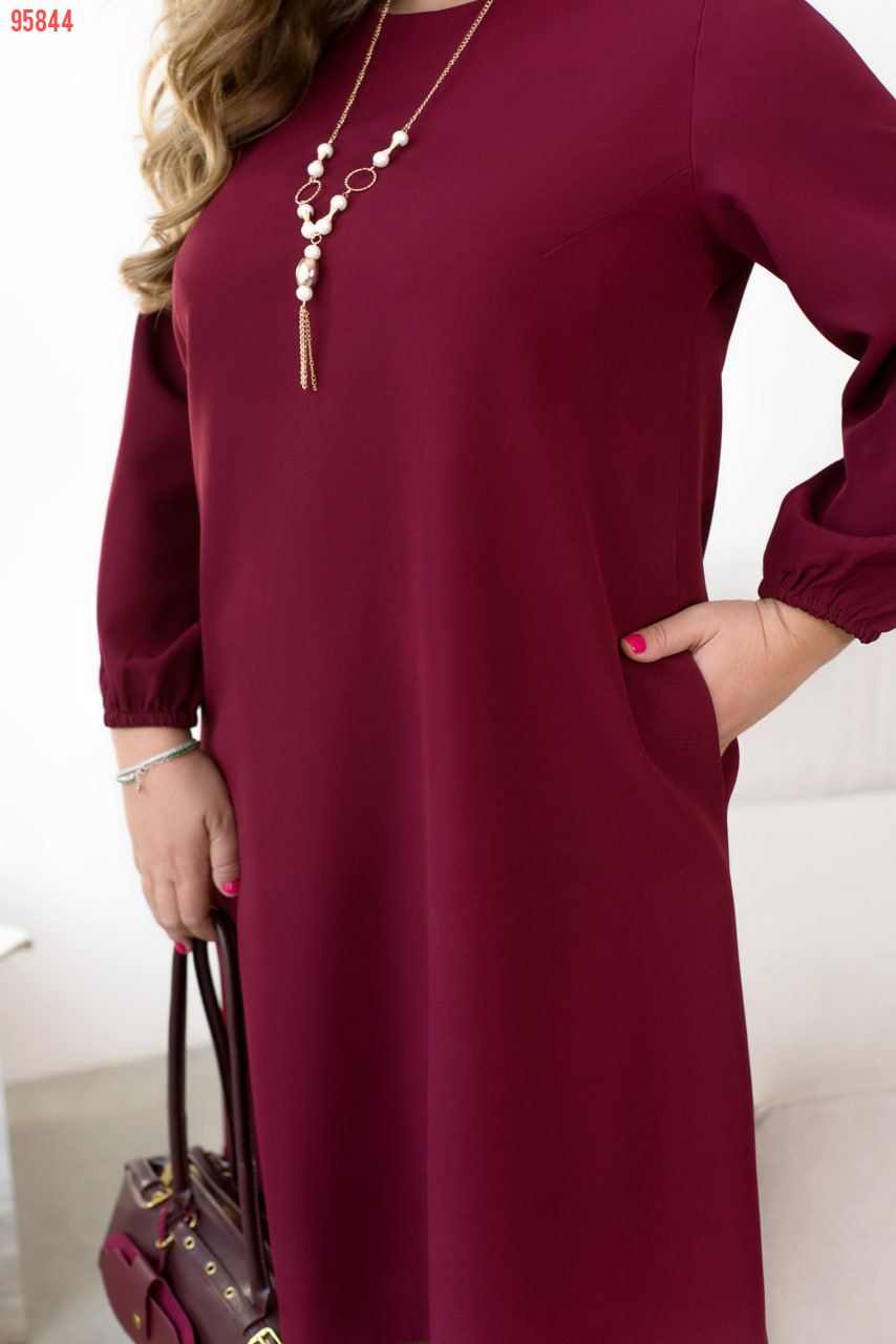 Елегантна та мінімалістична сукня з напівкруглим широким вирізом горловини. З боків - кишені в шві. Рукав вільний, на зап'ястку призібраний резинкою, без манжета. Застібок немає. На грудях діагональні виточки. Прикраса входить в комплект.