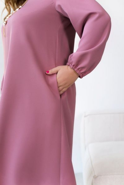 Елегантна та мінімалістична сукня з напівкруглим широким вирізом горловини. З боків - кишені в шві. Рукав вільний, на зап'ястку призібраний резинкою, без манжета. Застібок немає. На грудях діагональні виточки. Прикраса входить в комплект.