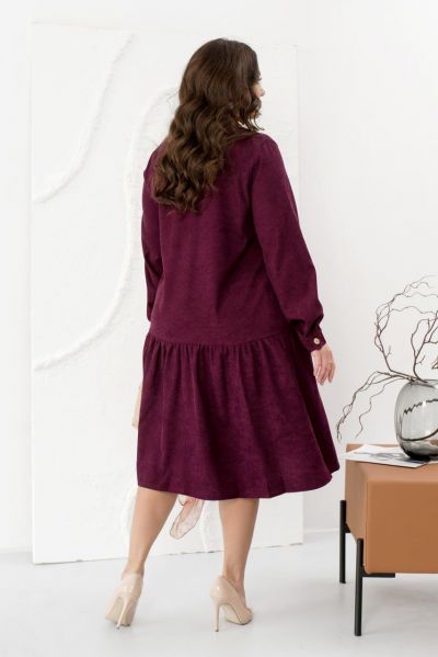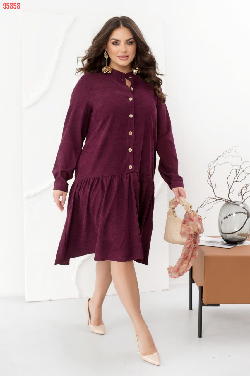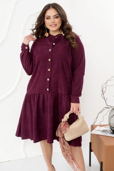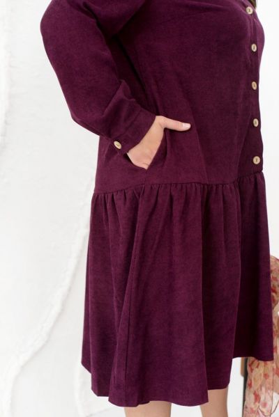Це жіночна сукня, виконана з м'якої вельветової тканини, зробить ваш образ стильним, модним і вишуканим. Модель доповнена коміром-стійкою, довгими рукавами з манжетами і повітряним грайливим воланчиком, підшитим до подолу, а також кишеннями. Сукня застібається на ряд гудзиків спереду по центру.