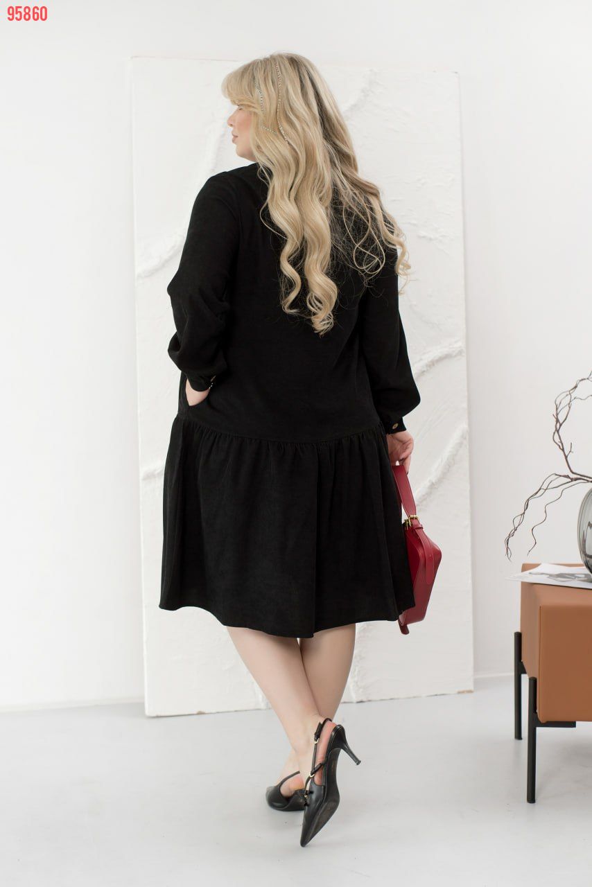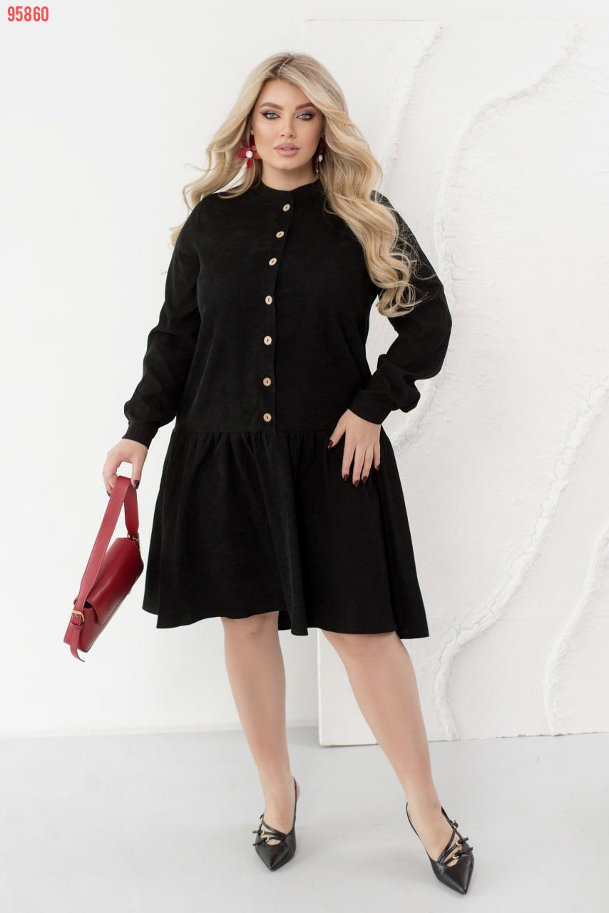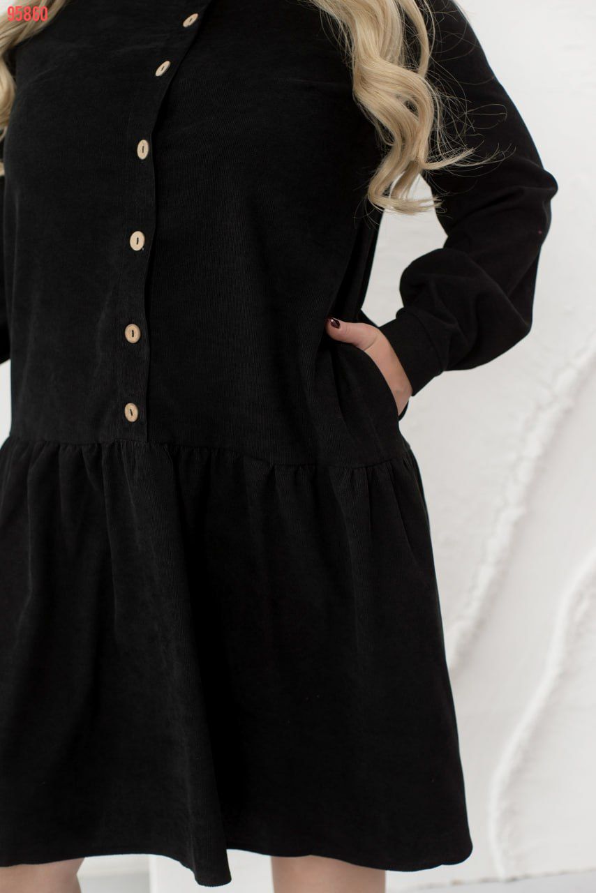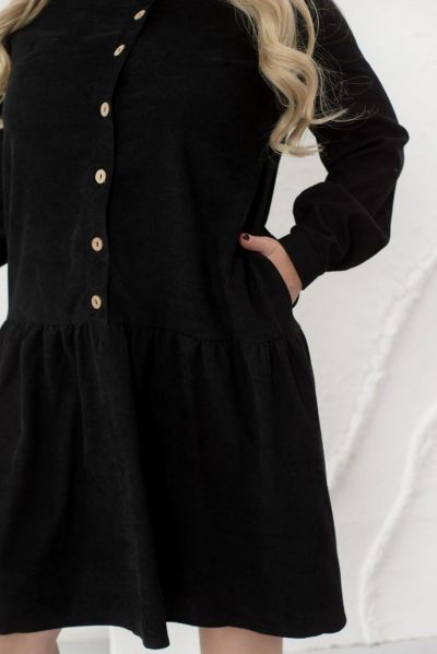 Це жіночна сукня, виконана з м'якої вельветової тканини, зробить ваш образ стильним, модним і вишуканим. Модель доповнена коміром-стійкою, довгими рукавами з манжетами і повітряним грайливим воланчиком, підшитим до подолу, а також кишеннями. Сукня застібається на ряд гудзиків спереду по центру.