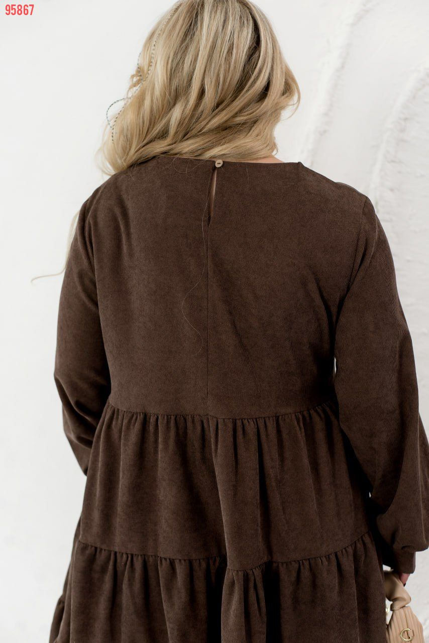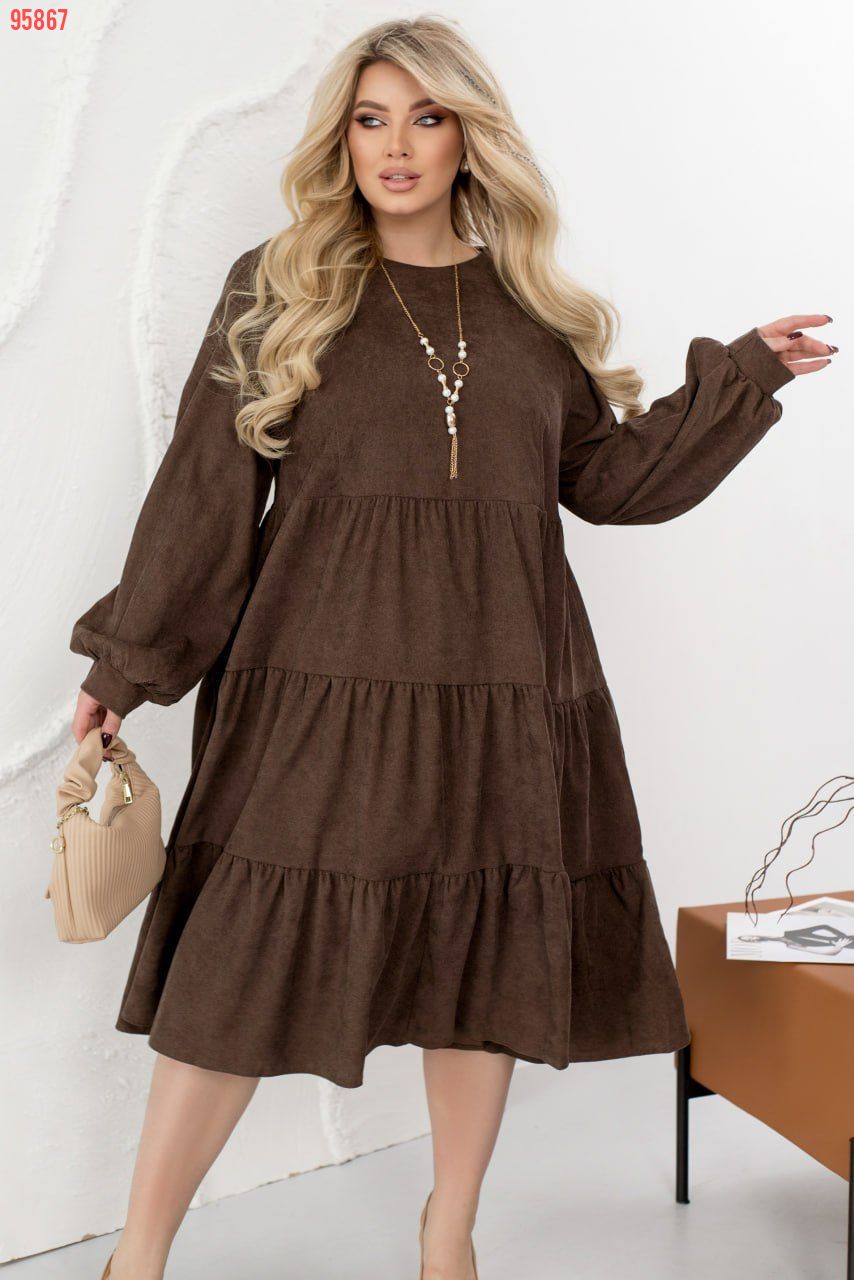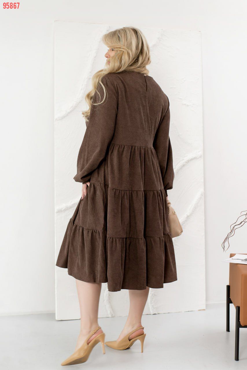 Повітряна сукня А-силуету, виконана з м'якого вельвету, дозволить вам навіть в прохолодну погоду і пору року виглядати жіночно і привабливо. Модель доповнена довгими рукавами з манжетами і застібкою на маленький гудзик під шиєю. Легкий подол, що складається з декількох шарів воланів, зробить ваш образ виразним і незабутнім. Зверніть увагу! На нижньому волані спереду по центру є шов. Прикраса додається в подарунок клієнту.