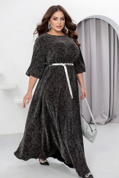 Довга сукня з мерехтливим дизайном – втілення ніжності, жіночності та святкової елегантності. Півкруглий виріз горловини та відрізна лінія талії підкреслюють фігуру, а спадаючі плісовані оборки додають легкості й витонченого руху. Рукави довжиною 3/4 з м’якими резинками на зап’ястках створюють об’єм і делікатний акцент. Вертикальні виточки формують красивий силует, а поясок із комплекту дозволяє обрамити талію, додаючи завершеності образу. Ця сукня м’яко виблискує при кожному русі – ідеальний вибір для особливих моментів, коли хочеться сяяти по-справжньому. Срібний пояс входить в комплект.