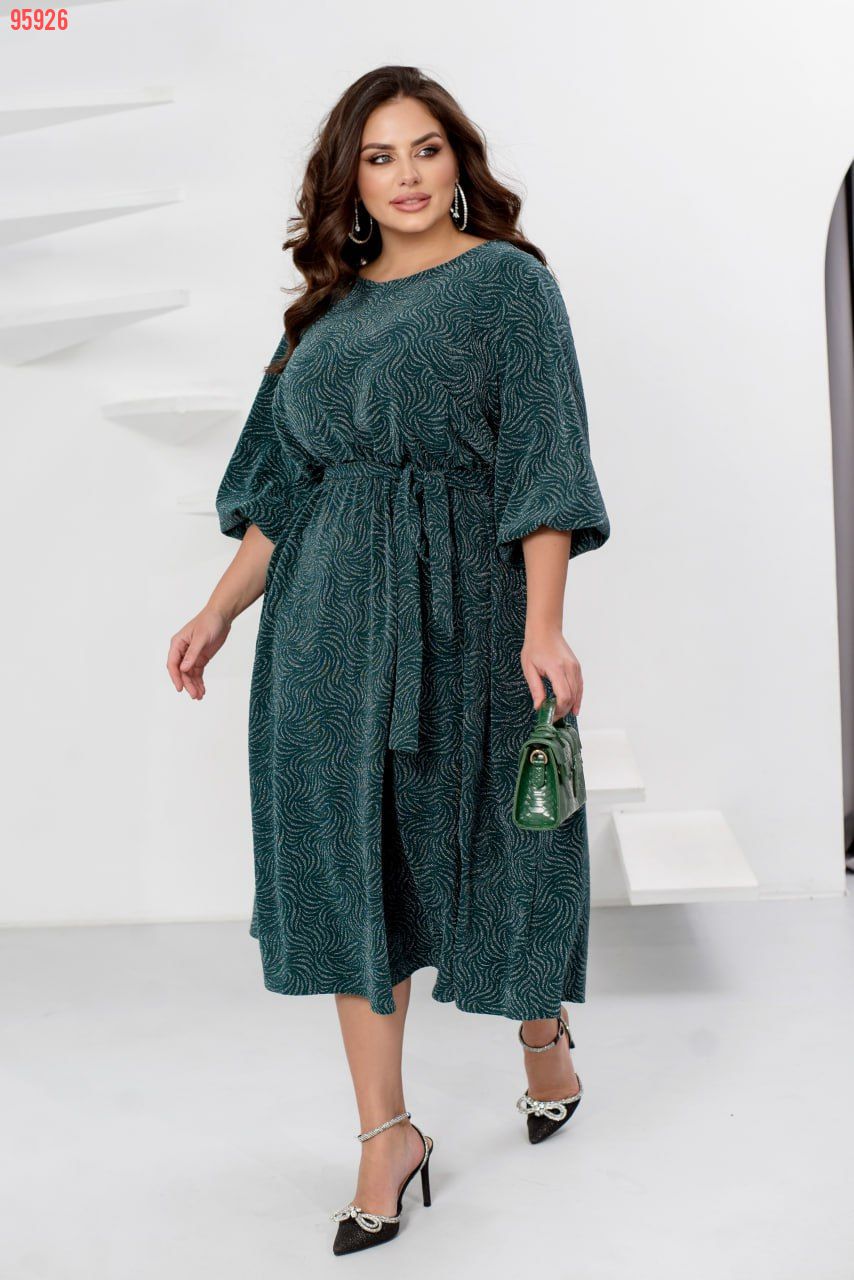 Сукня міді з мерехтливим дизайном – витончений баланс між елегантністю та повсякденною зручністю. Півкруглий виріз горловини, відрізна лінія талії та м’які плісовані оборки створюють ніжний жіночний силует. Рукави 3/4 із легким об’ємом на зап’ястках додають шарму, а поясок із комплекту підкреслює талію. М’який блиск тканини м’яко грає на світлі, надаючи образу святкового настрою навіть у звичайний день. Срібний пояс входить в комплект.