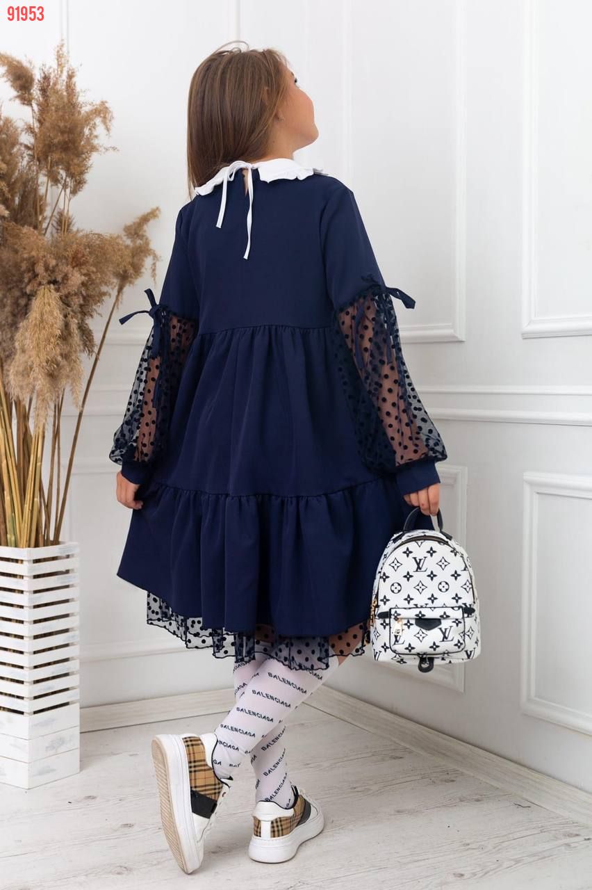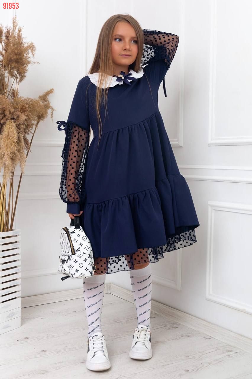 Стильна шкільна сукня з білим мереживним комірцем виготовлена ​​з костюмної тканини та сітки флок. Завдяки розкльошеному фасону відмінно сидить на худеньких дівчатках і на дівчатках з формами.