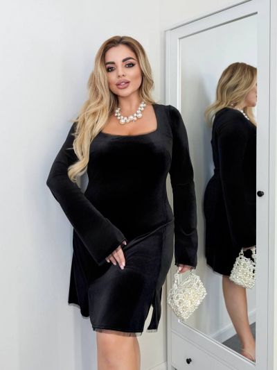 Вишукана сукня з королівського оксамиту з розрізами знизу та подовженим рукавом. Сукня декорована тонкою сіточкою. Підходить для повсякденних днів та заходів.