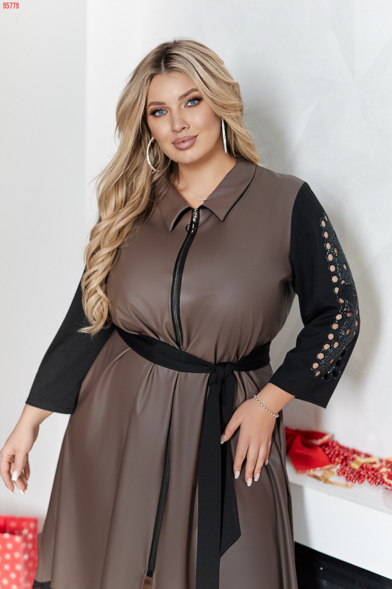 Тканина: Еко шкіра гарної якості + рукава та пояс з Італійського трикотажу + лазерна різка по тканині + стрази DMS + мереживо по низу сукні.