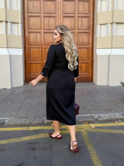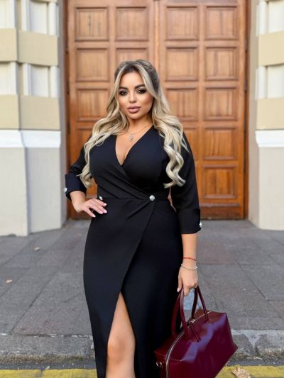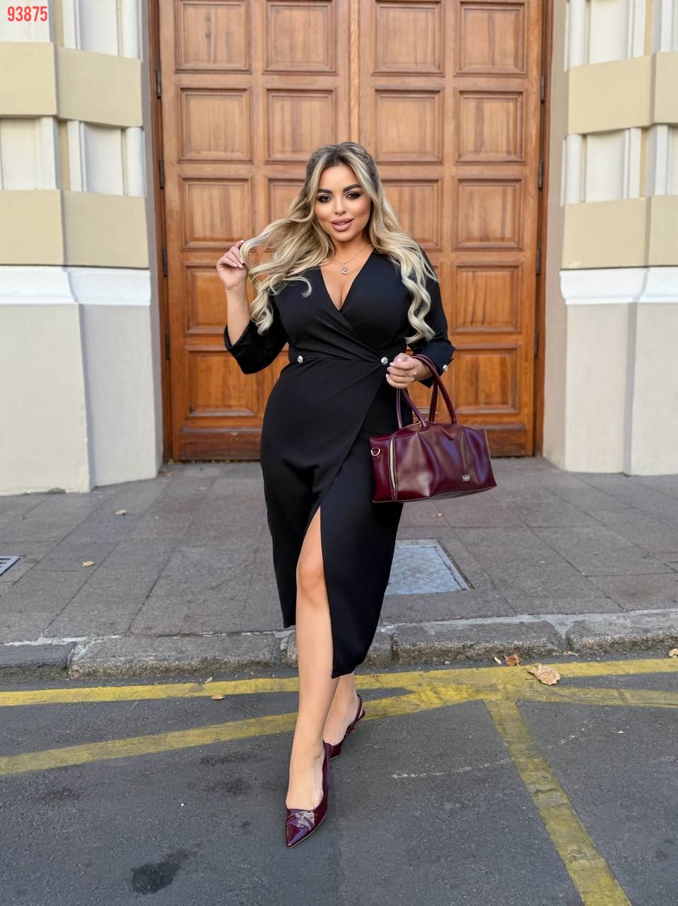 Плаття приталенного крою , ззаду молнія , на талії та рукавах ґудзики , низ та верх плаття на запах.