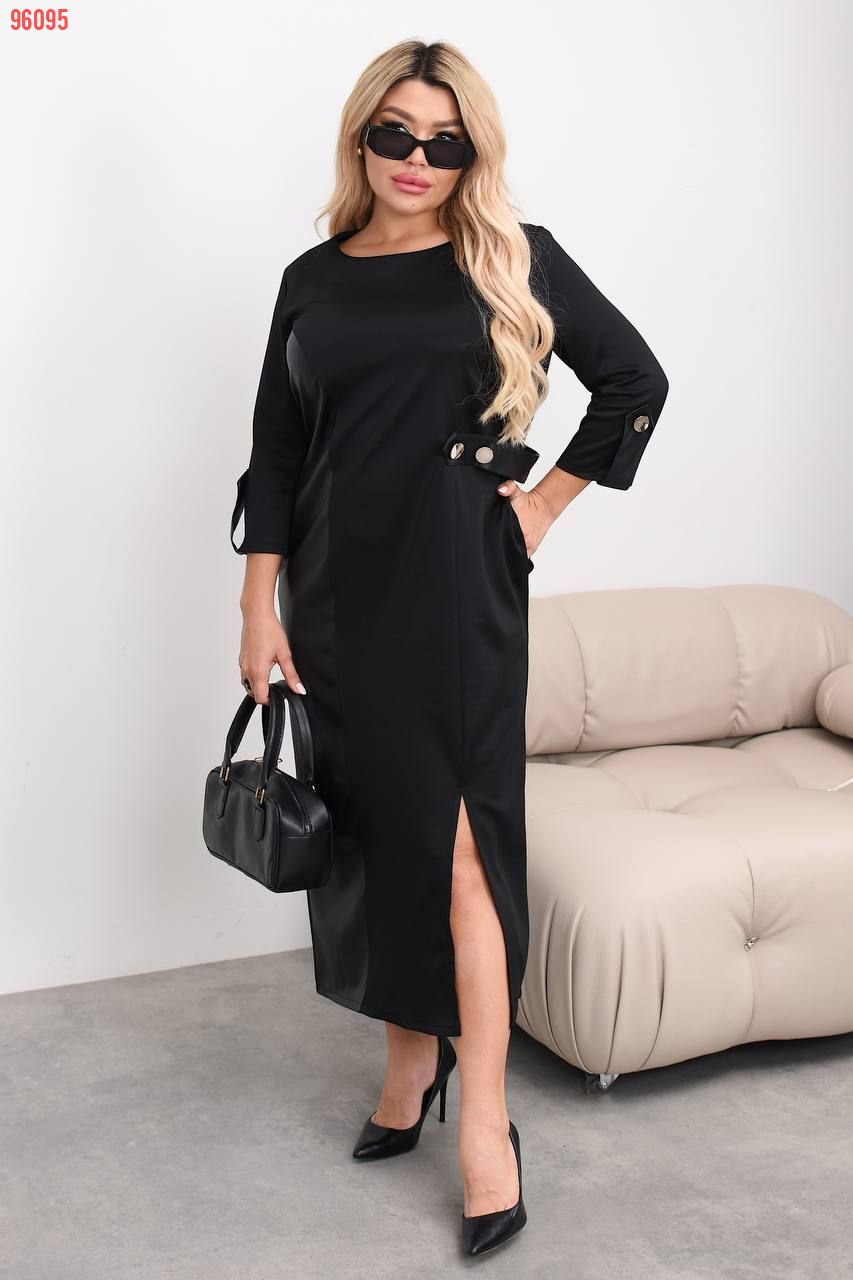 Плаття приталеного силуету , з боку вставка з екошкіри, яка подовжує та витягує візуально фігуру . По низу розріз , з боку на талії «хлястік» з ґудзиками , рукава нижче ліктя прикрашені ґудзиками та шкіряним патиком .