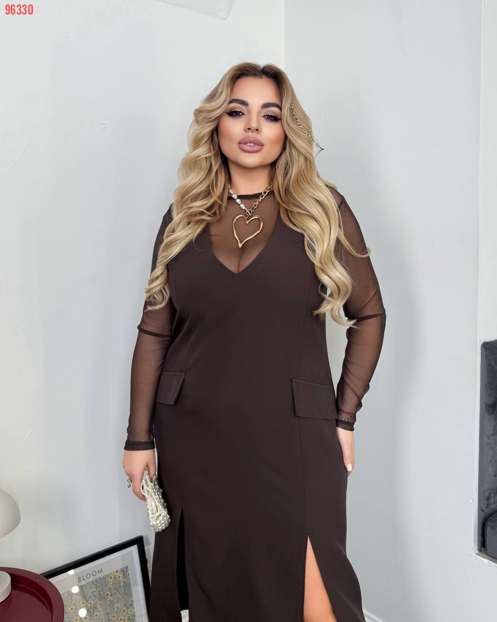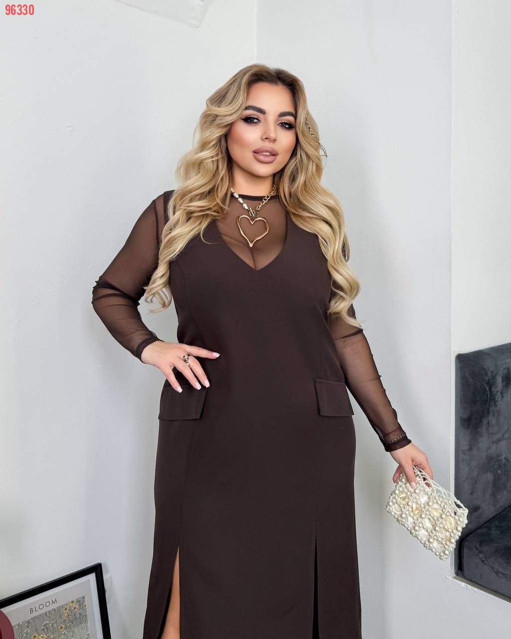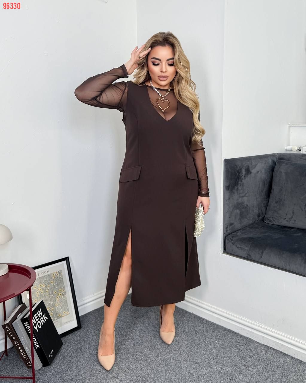 Нарядний комплект : плаття без рукавів , з боків дві кишені -імітації , спереду два розрізи вище колін, V-образний виріз; гольф з довгим рукавом.