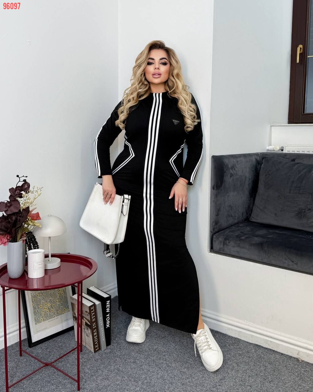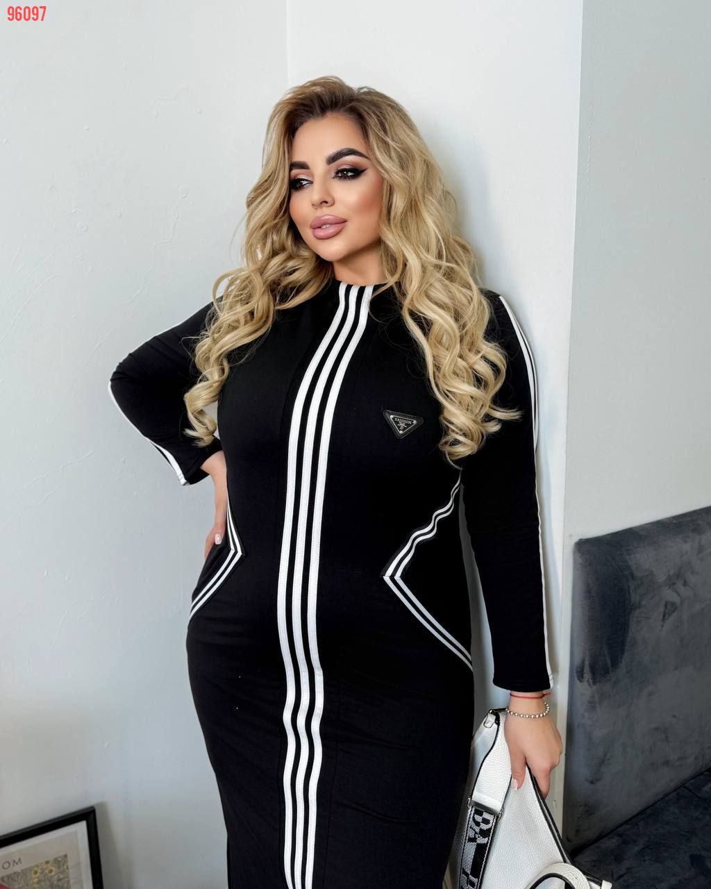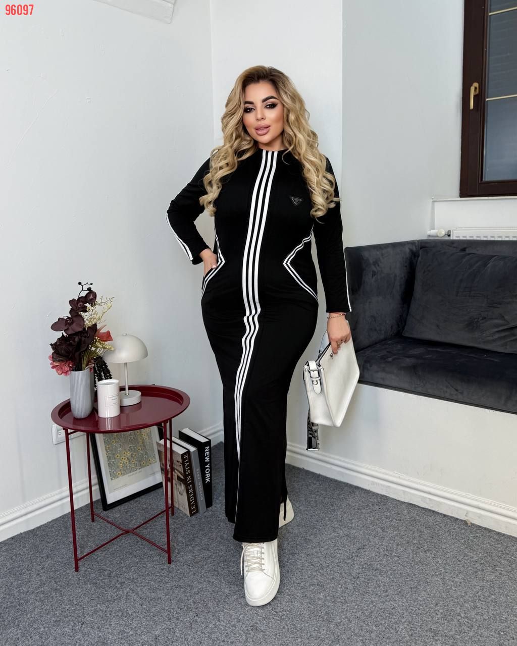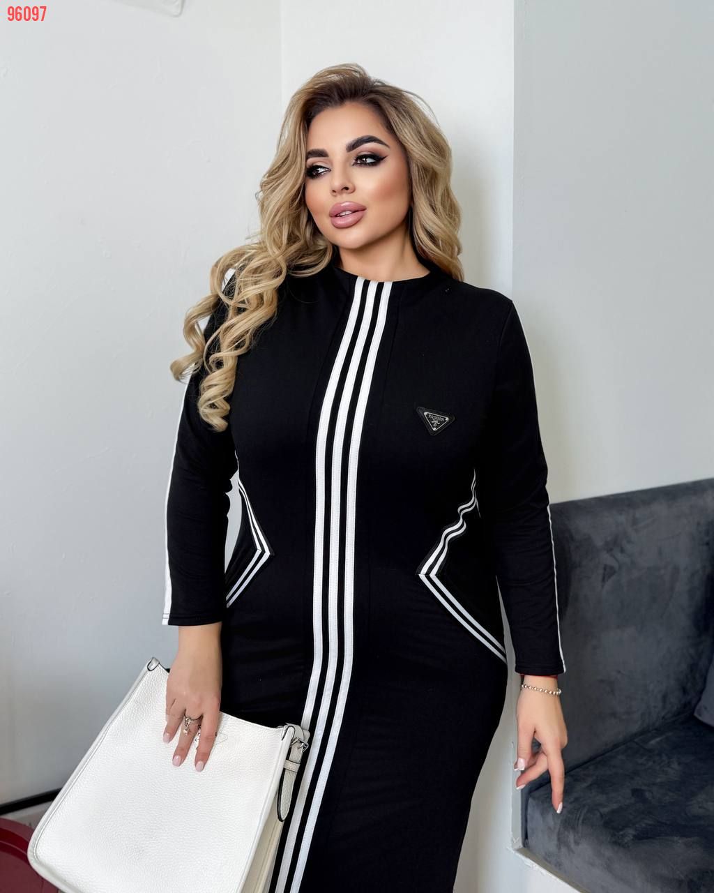 Склад тканини : 50%полиестер, 30%вискоза, 15%район, 5%спандекс. Плаття приталеного крою , прикрашене спереду лампасами в три ряди ( подовжує силует та робить фігуру більш витонченою ). На рукавах та кишенях чорно-білі лампаси , з боків кишені , на грудях прикраса , по низу з боків розрізи.
