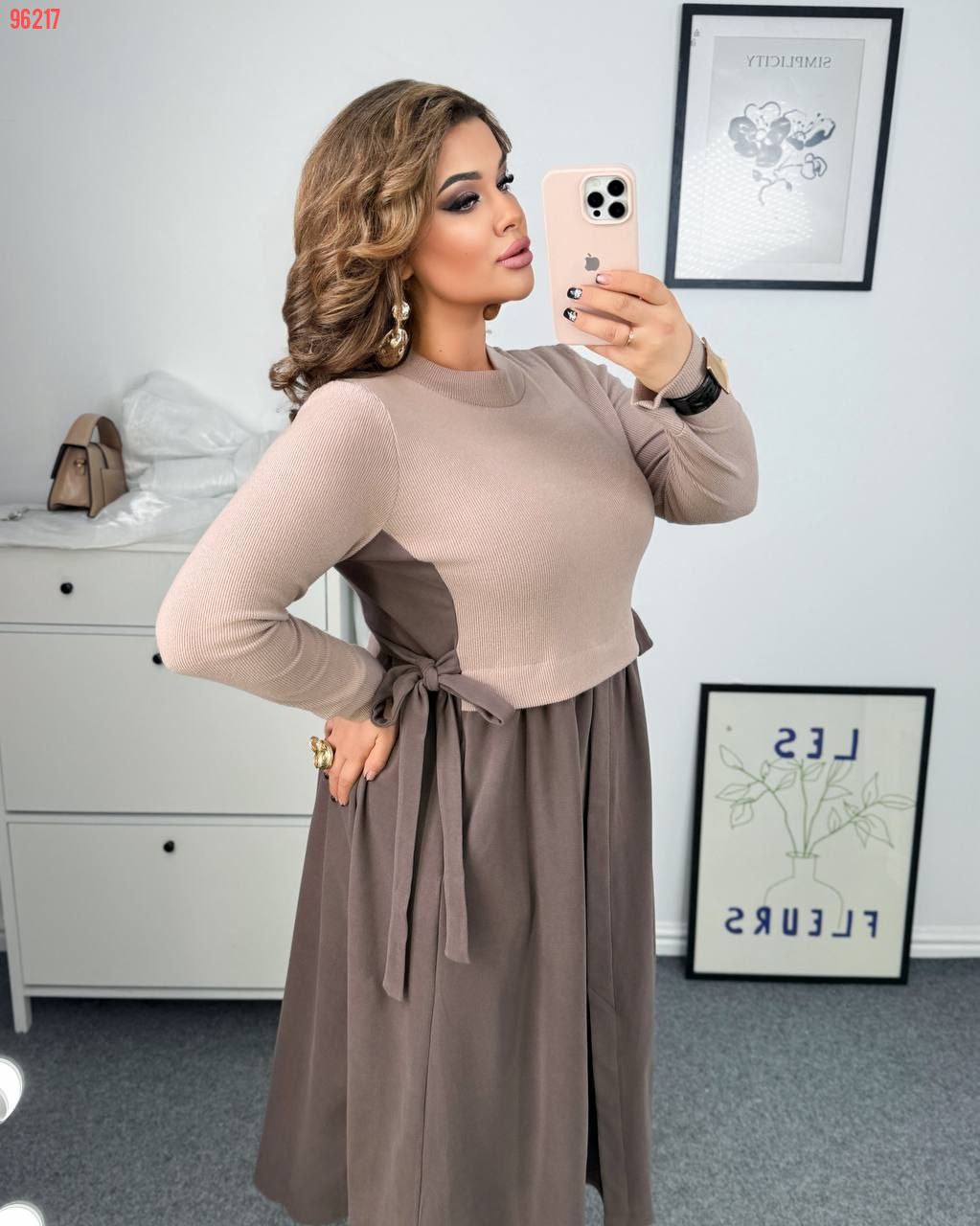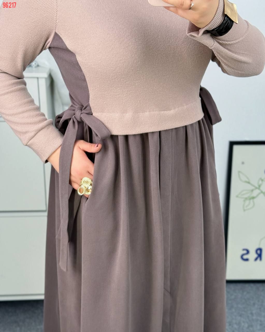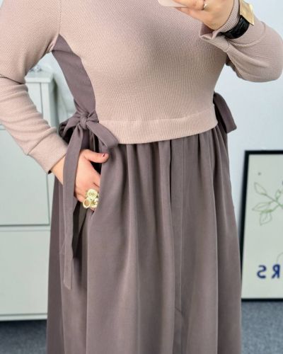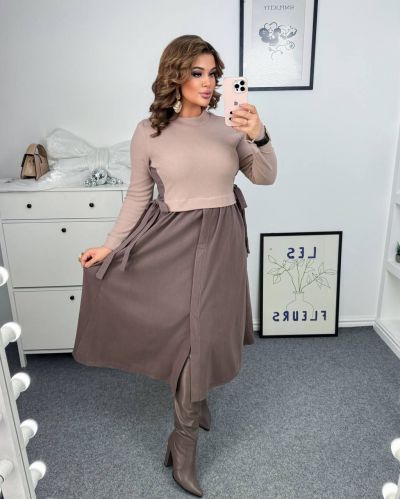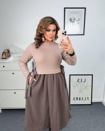 Тепла, комфортна сукня із якісного трикотажу з гарною розтяжністю (до ±5 см). Дуже приємна до тіла, гарно тримає форму і підходить для прохолодної пори року. Поєднання кольорів беж + шоколад або сірий + чорний створює стильний контрастний ефект. Силует вільного крою – ідеальний для plus size фігури