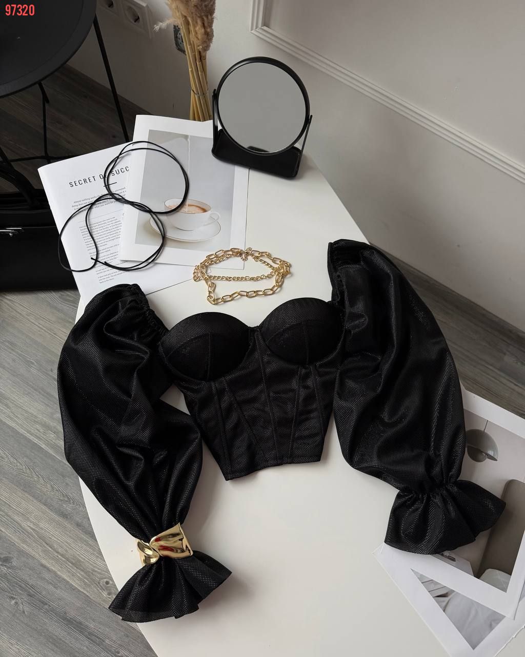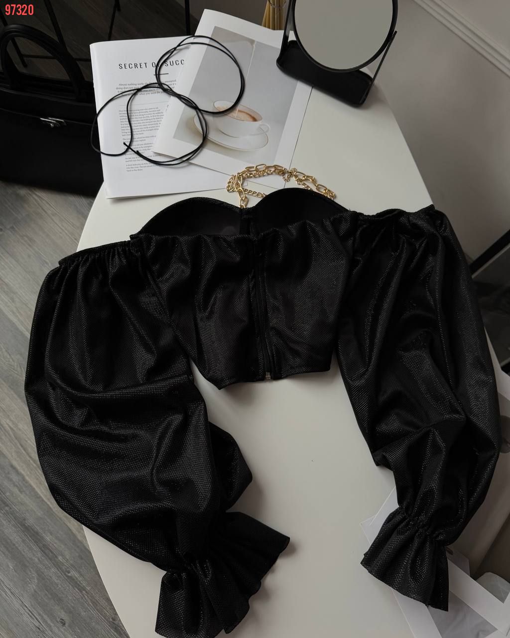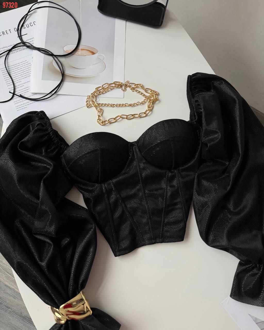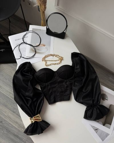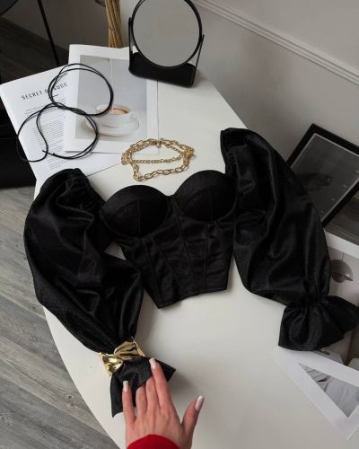 Неймовірно сяючий топ - бюстʼє з імітацією корсету та спущеними пишними рукавами. Тримає форму. Спинка йде на змійці.