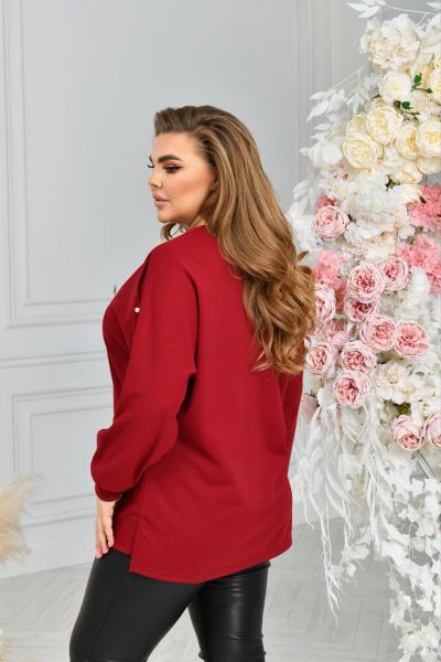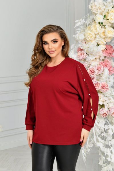 Стильна ошатна туніка із трикотажу креп-стретч (розтяжність середня). Силует «летюча миша». Виріз горловини круглий. Рукави на манжетах, цільнокроєні, виконані дуже оригінально із прорізями, декоровані якісними штучними пробивними перлинками ( закріплені надійно). Низ туніки асиметричний, попереду трохи коротший. З боків оброблені невеликі розрізи. Застібок, кишень немає.
