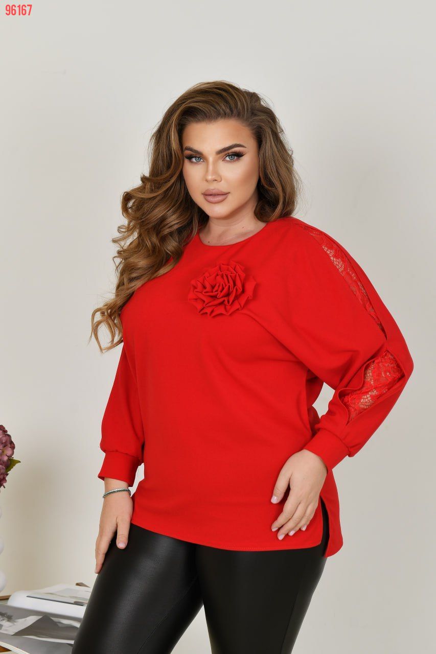 Стильна та вишукана туніка вільного прямого силуету із трикотажу креп-стретч (розтяжність середня), виріз горловини круглий, рукав 3/4. Низ асиметричний, з невеликими розрізами. Туніку декоровано трояндою із основної тканини (за потреби можна зняти). Кишень та застібок немає.