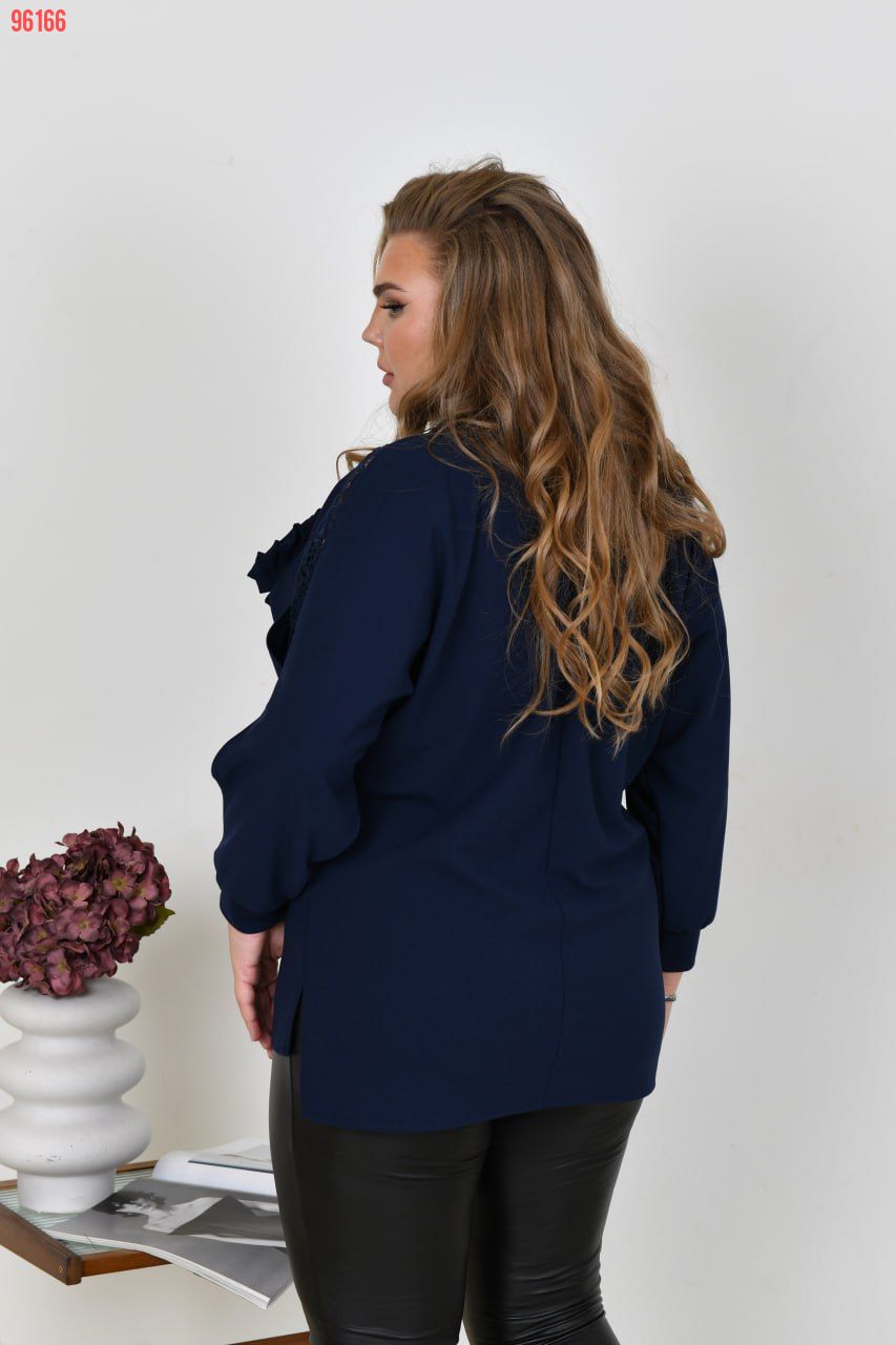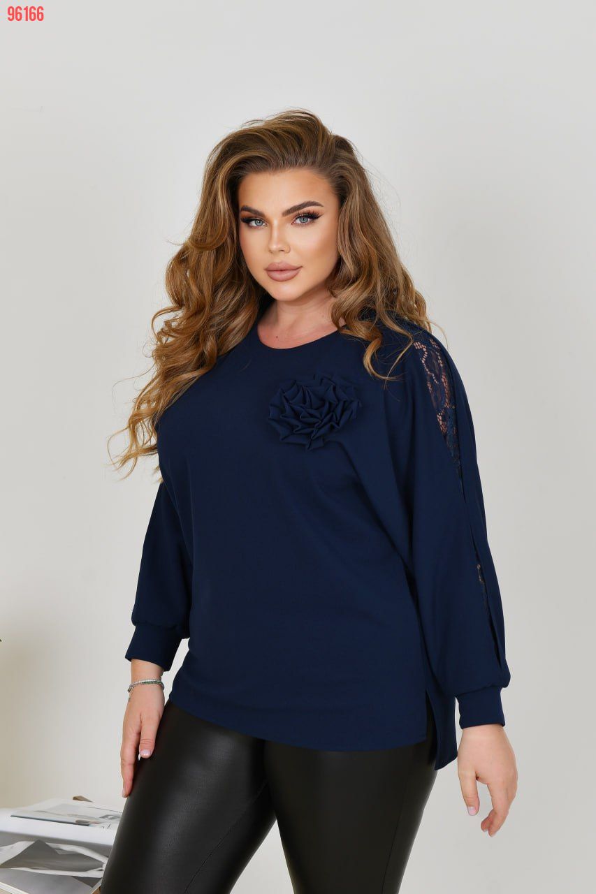 Стильна та вишукана туніка вільного прямого силуету із трикотажу креп-стретч (розтяжність середня), виріз горловини круглий, рукав 3/4. Низ асиметричний, з невеликими розрізами. Туніку декоровано трояндою із основної тканини (за потреби можна зняти). Кишень та застібок немає.