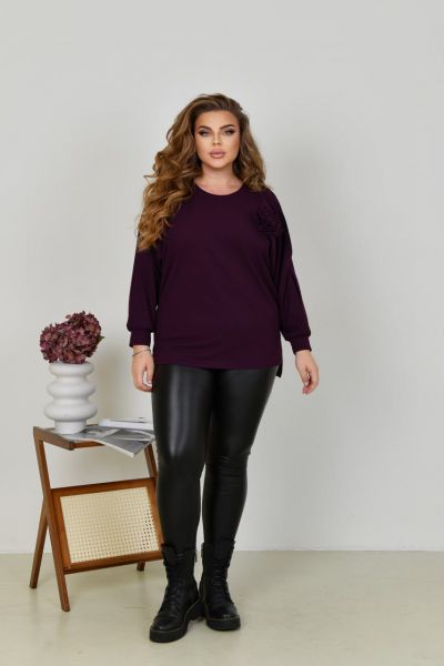 Стильна та вишукана туніка вільного прямого силуету із трикотажу креп-стретч (розтяжність середня), виріз горловини круглий, рукав 3/4. Низ асиметричний, з невеликими розрізами. Туніку декоровано трояндою із основної тканини (за потреби можна зняти). Кишень та застібок немає.