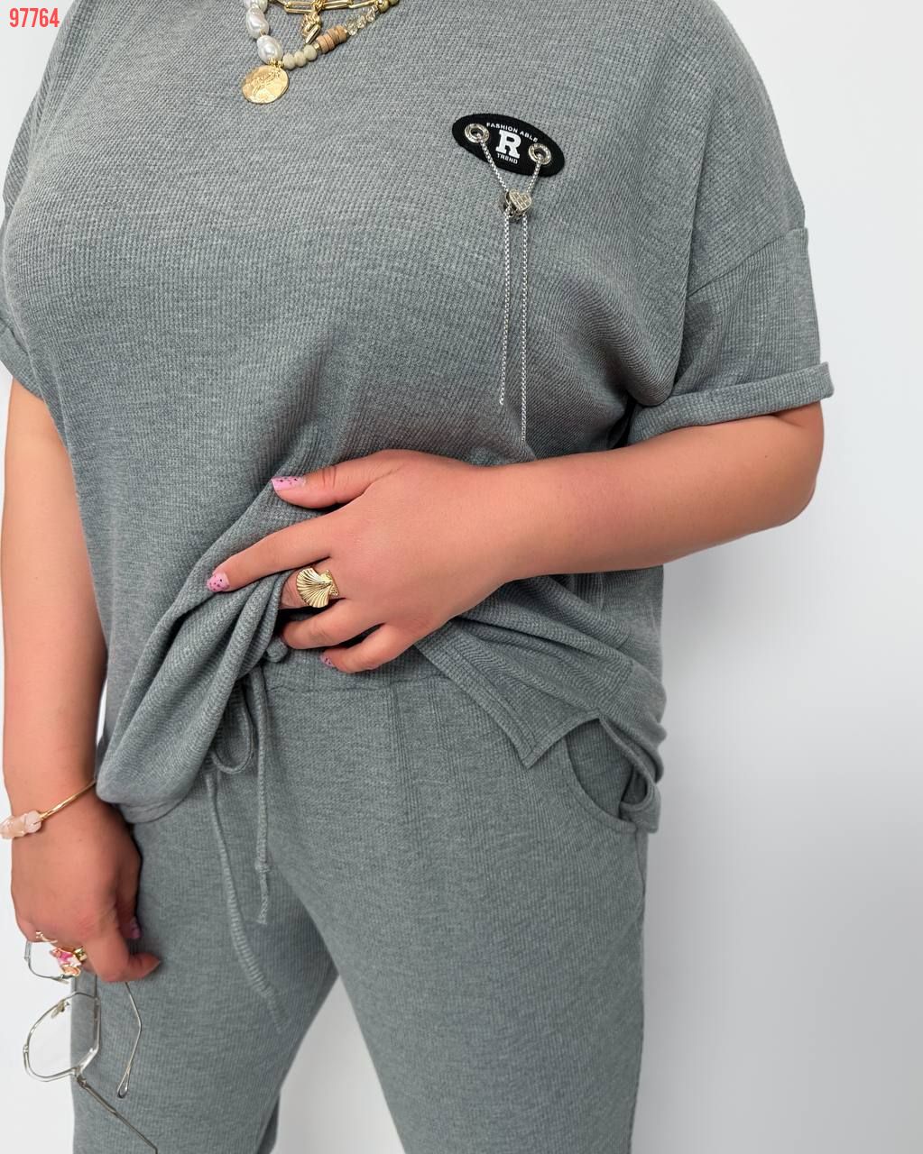 Вільний спортивний костюм з трикотажу «Вафелька»: футболка подовжена з акс + бриджі на гумці з кішенями у бічних швах, з високою